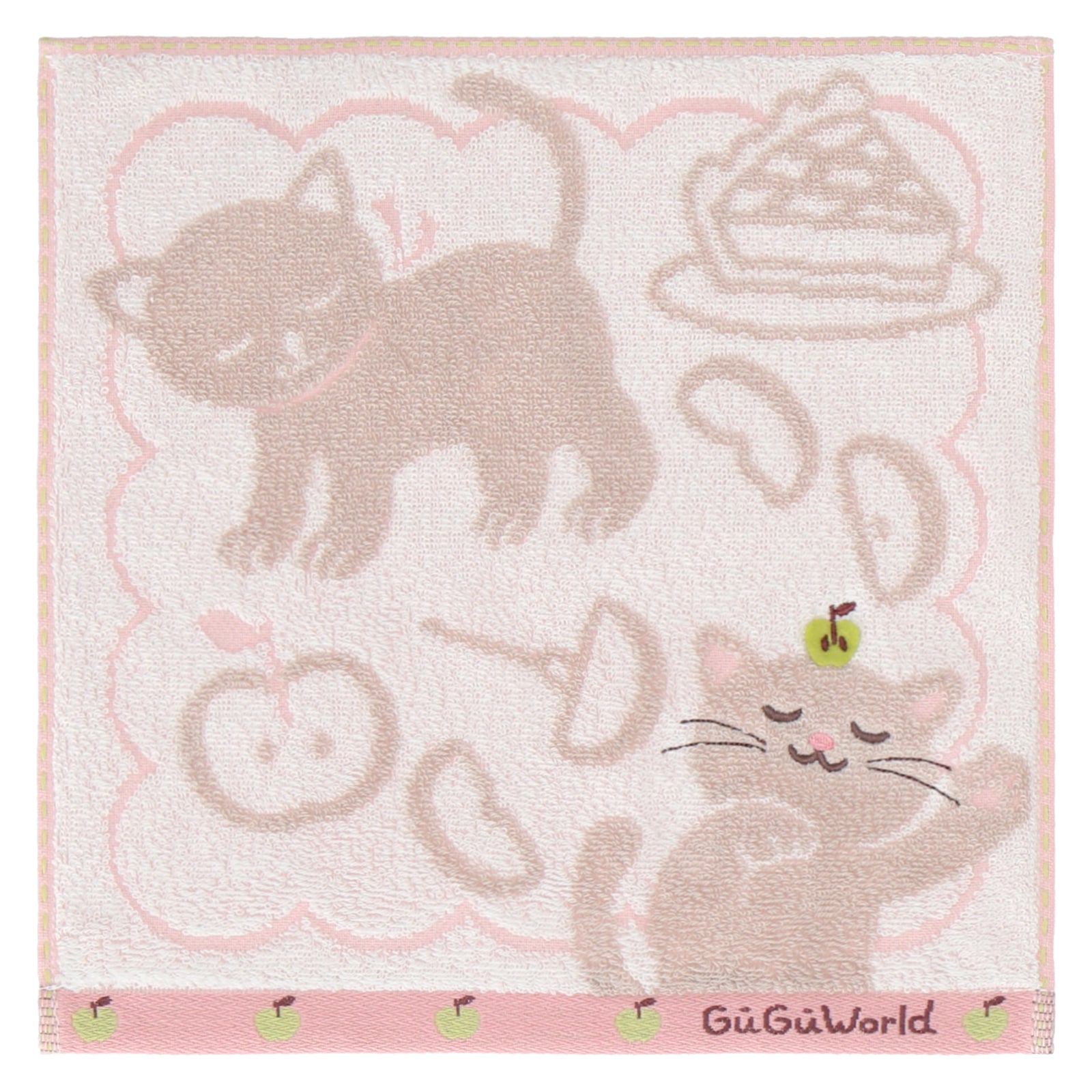 すやすや眠るネコがかわいいタオルハンカチ。りんごのアップリケ刺繡がアクセントになっています。ギフトにもおすすめ。