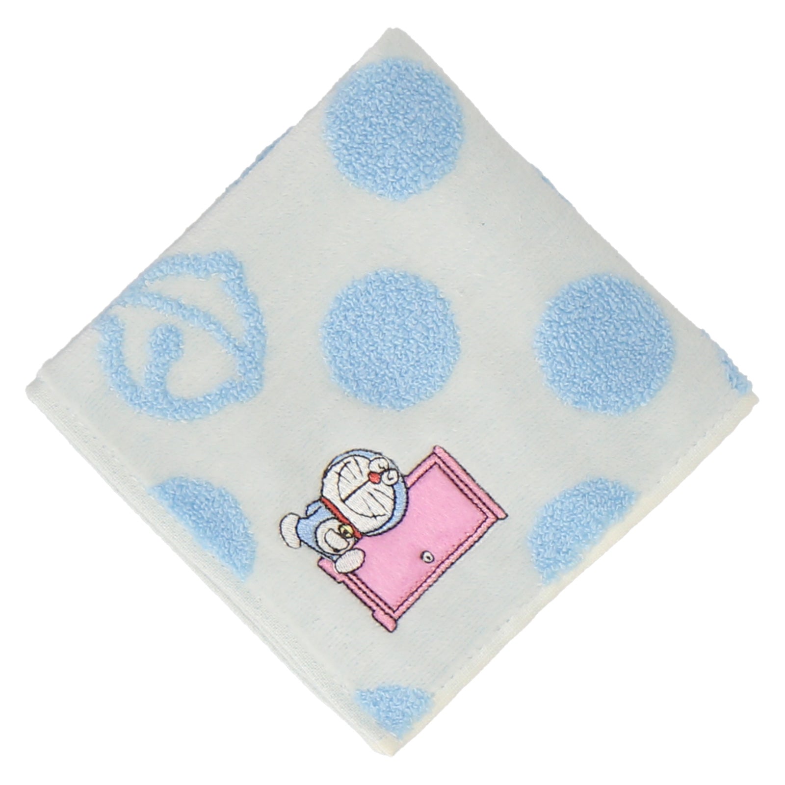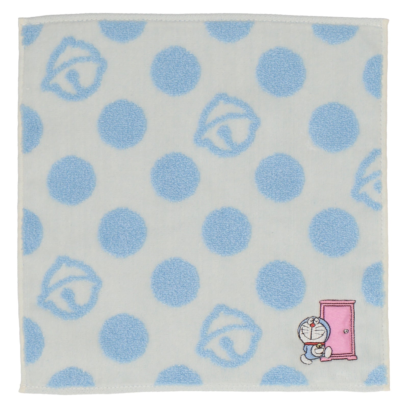 どこでもドアをモチーフにしたドットのタオルハンカチ。よく見るとドットの中にドラえもんの鈴が混じっています。ご自身はもちろん、ちょっとした贈り物にもおすすめです。