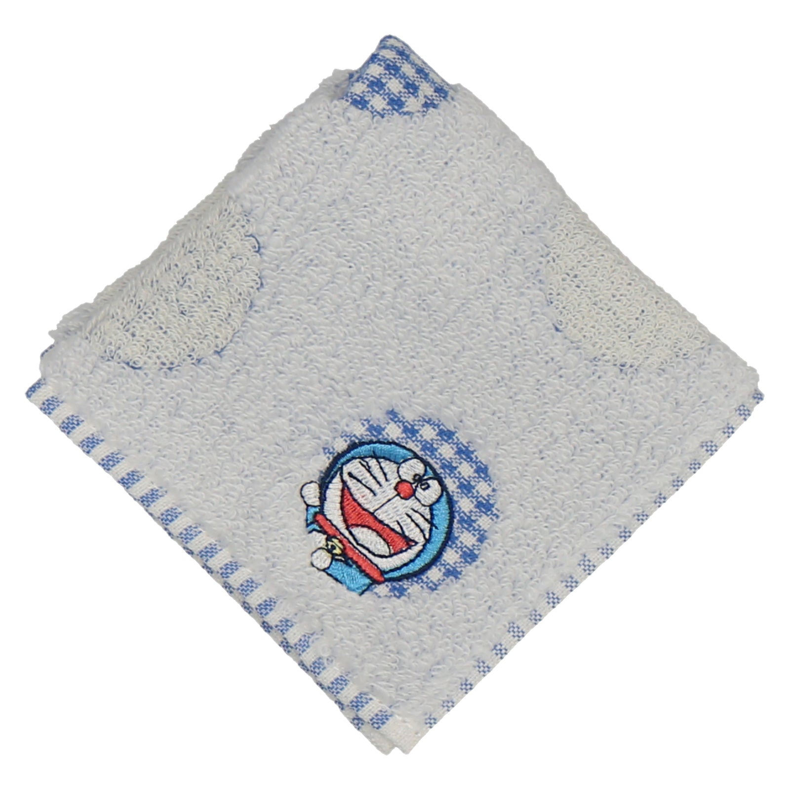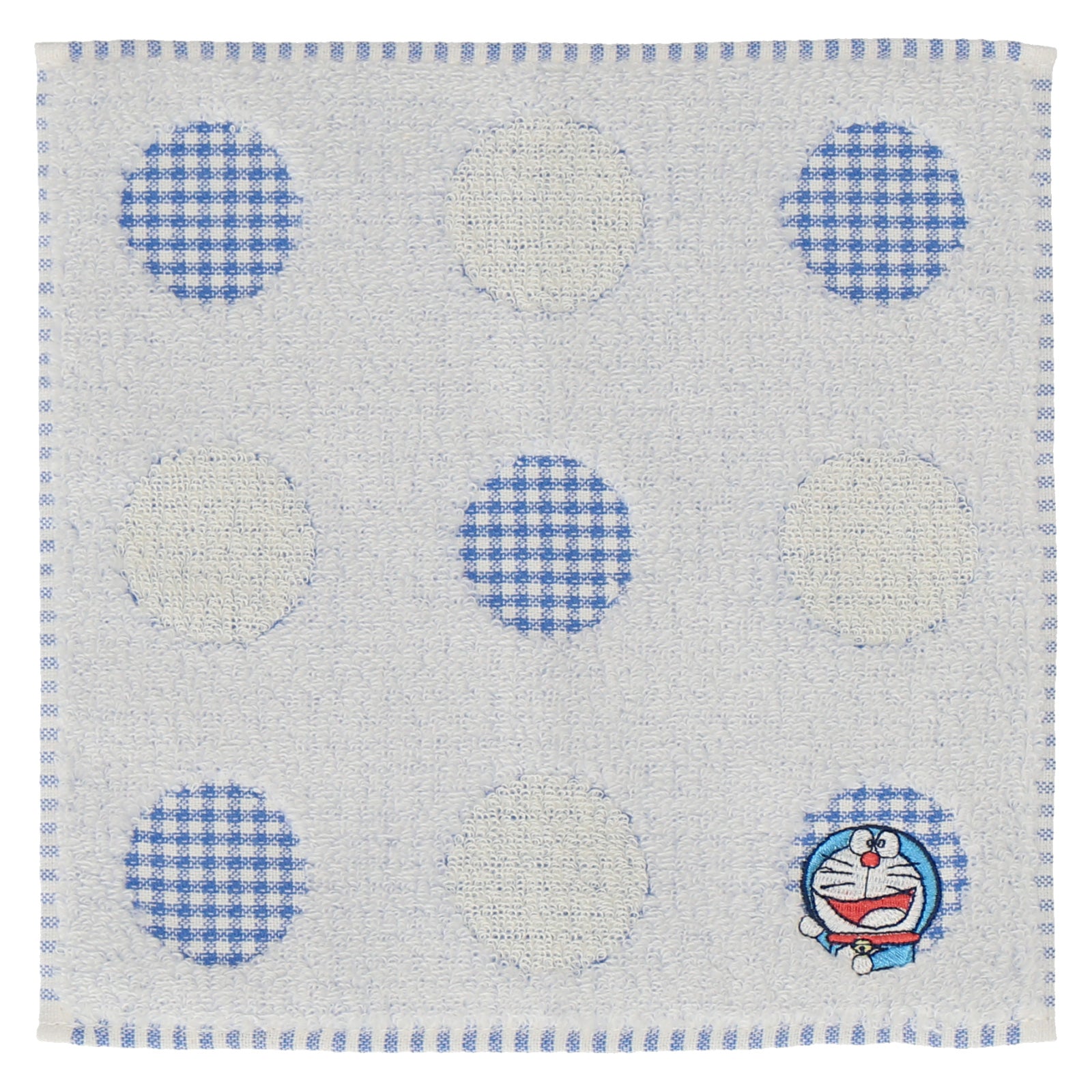 小さいサイズのタオルハンカチ。丸いギンガムチェックの窓からドラえもんが覗いています。ご自身はもちろん、ちょっとした贈り物にもおすすめです。