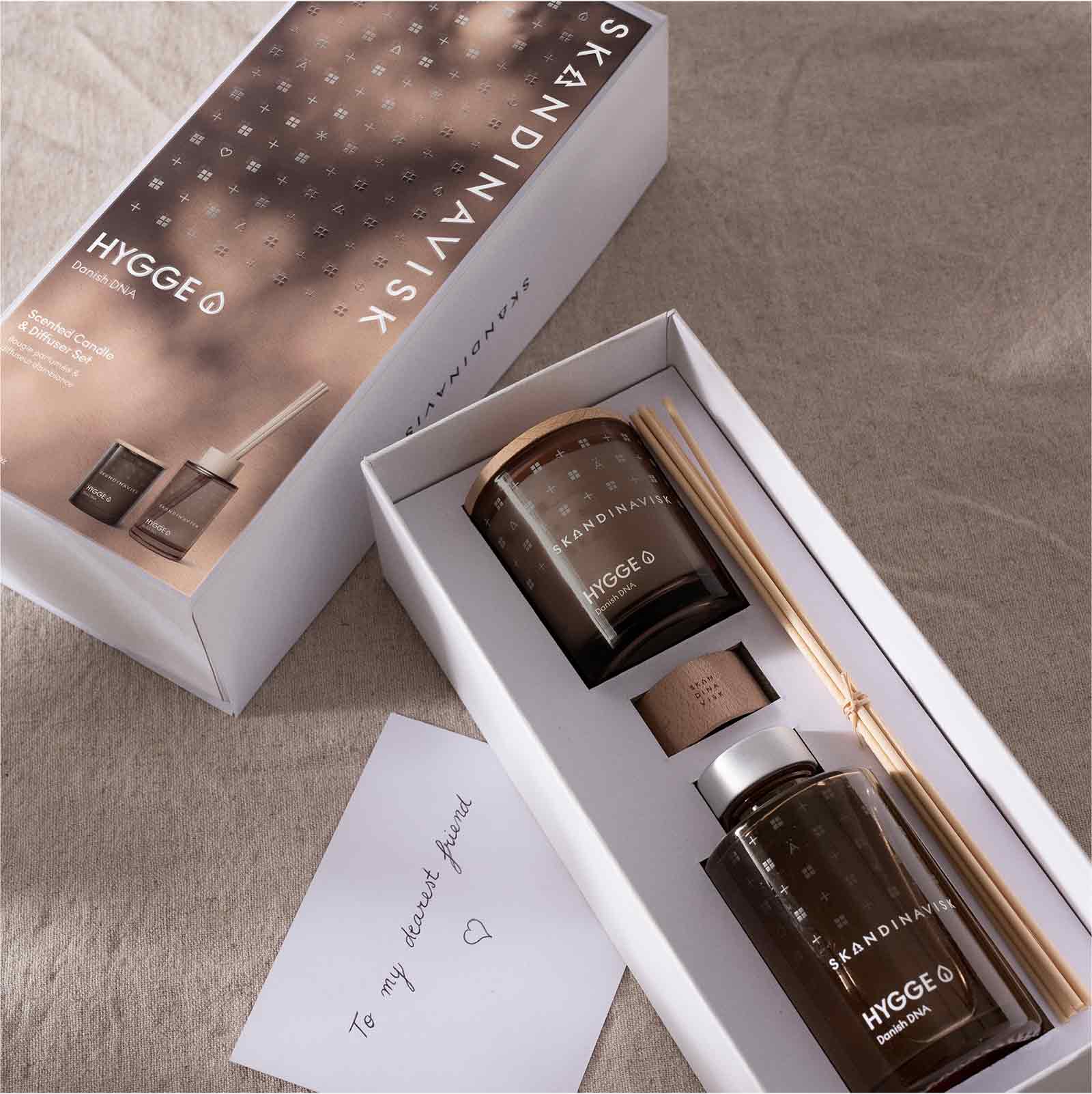 ヒュッゲの香りのキャンドルとディフューザーのギフトセット。