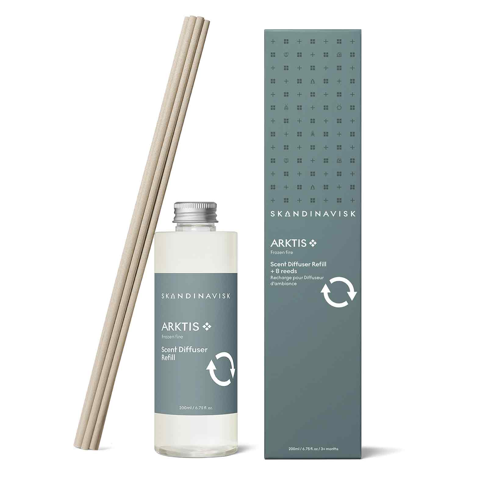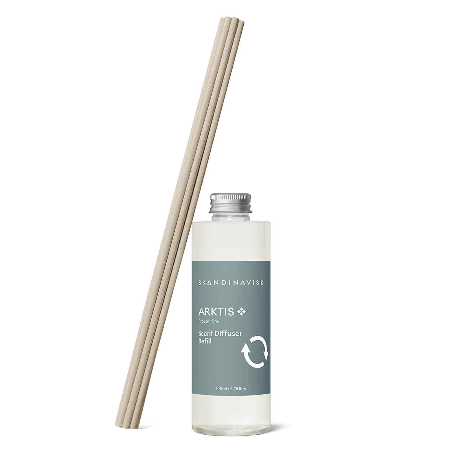 スカンジナビスクの200mLディフューザーに詰め替え用を丁寧に注ぎ、リードを交換した後、すすいで空になった詰め替えボトルをリサイクルしてください。