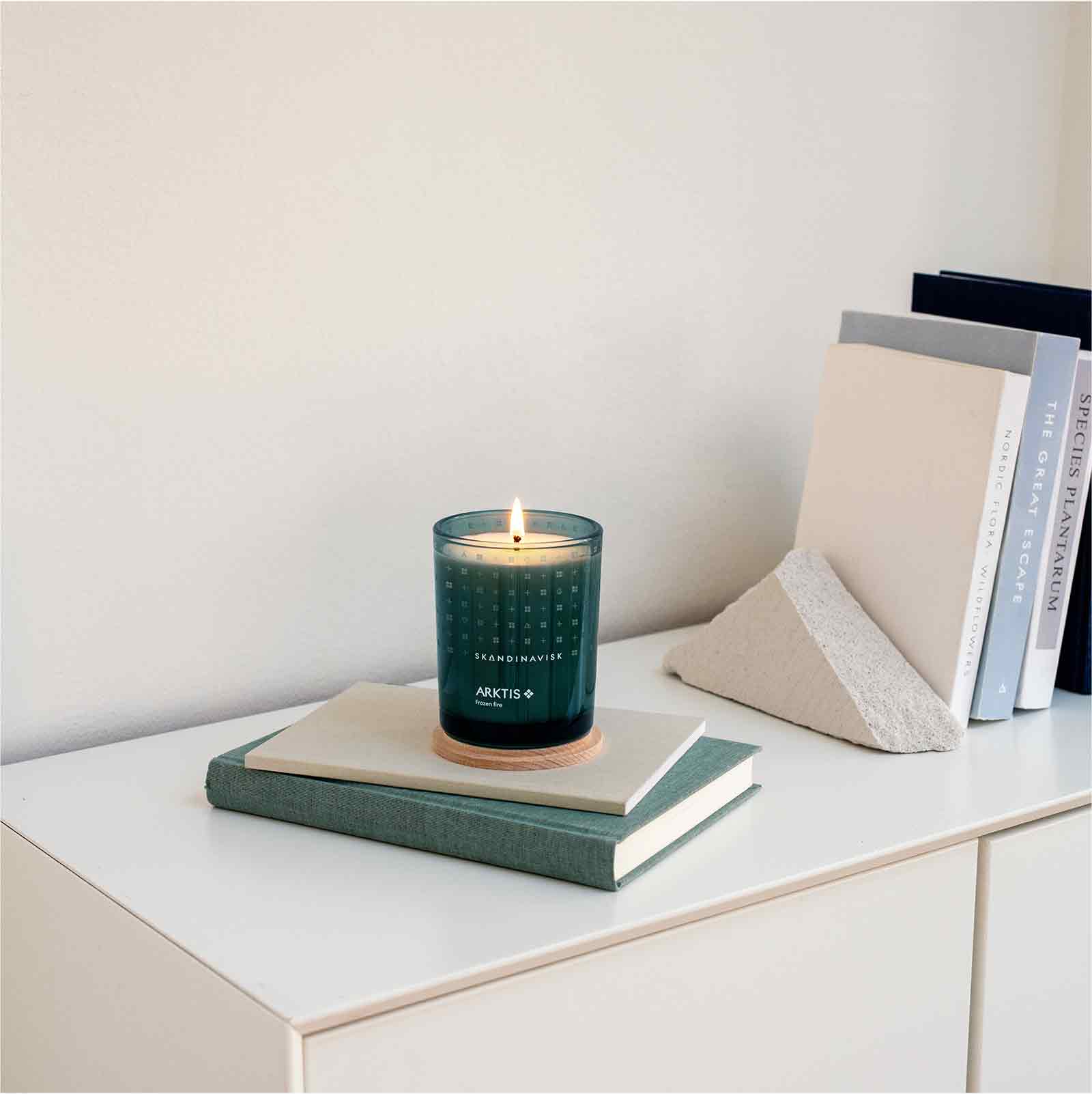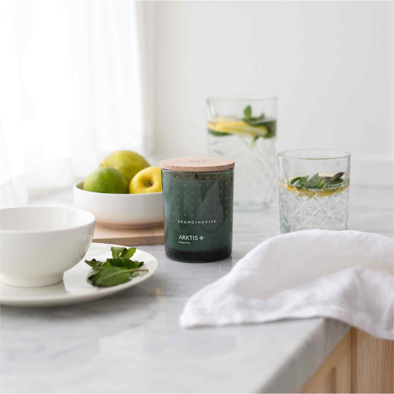 持続可能な農法で栽培され、遺伝子組み換えでないスウェーデンの菜種油から作られたロウを使用したアロマキャンドル。