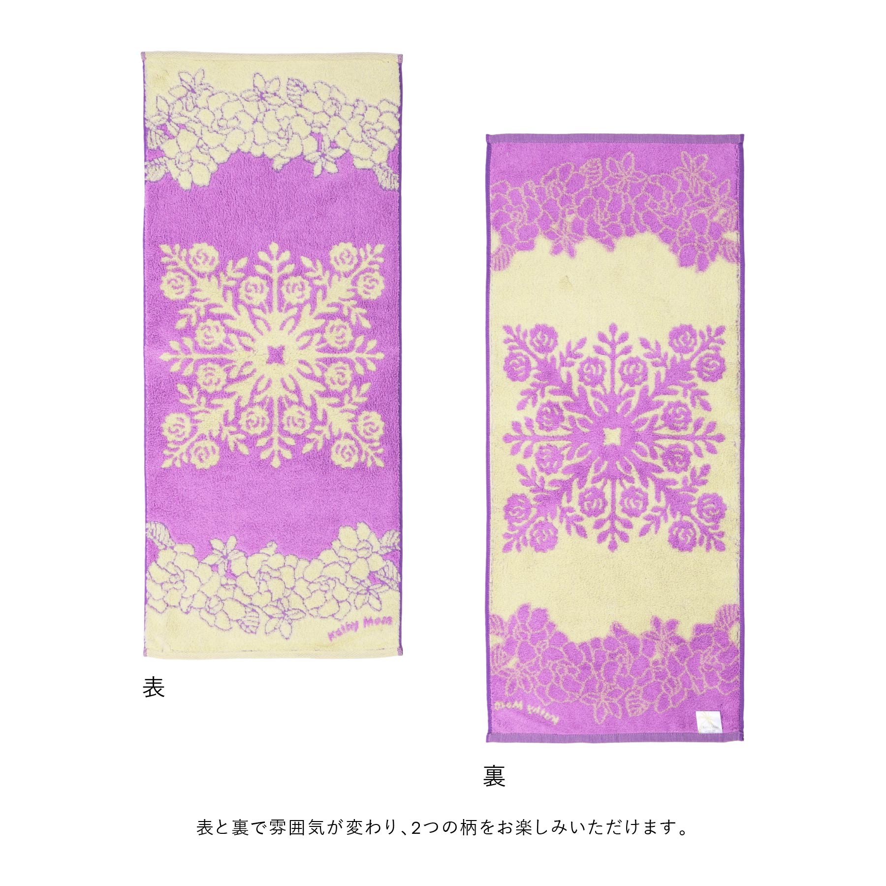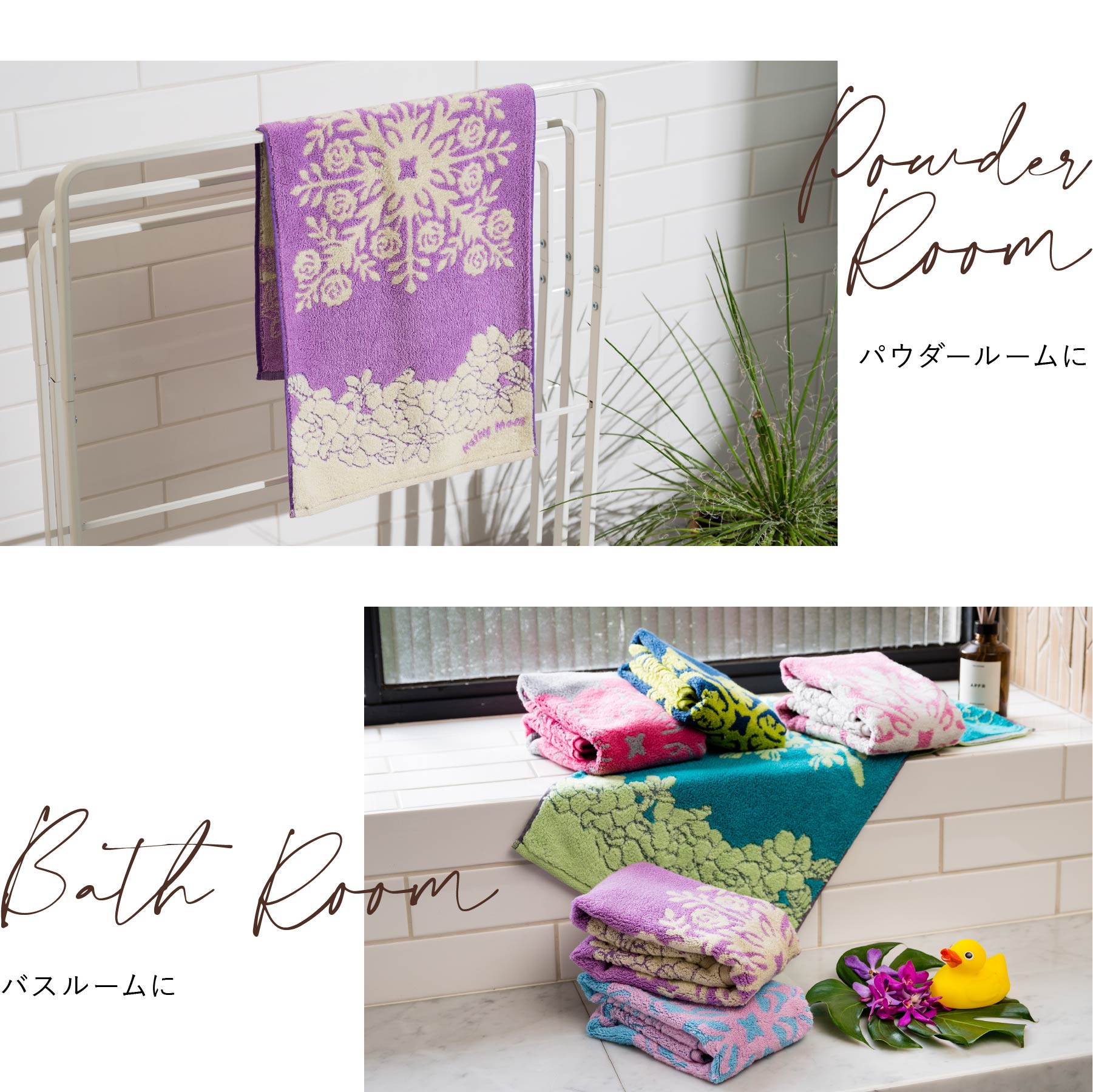 独自の特殊な撚りをかけた光沢感のあるコットンを使用。ソフトな風合いと優れた吸水性を実現しました。 柄の部分は肌ざわりフワフワの無撚糸パイル、背景はさらっとした肌触りの撚糸パイルで、柄を鮮やかに表現しています。 また、柄の一部に「落とし」の技法を加えることで、立体感のある仕上がりになっています。