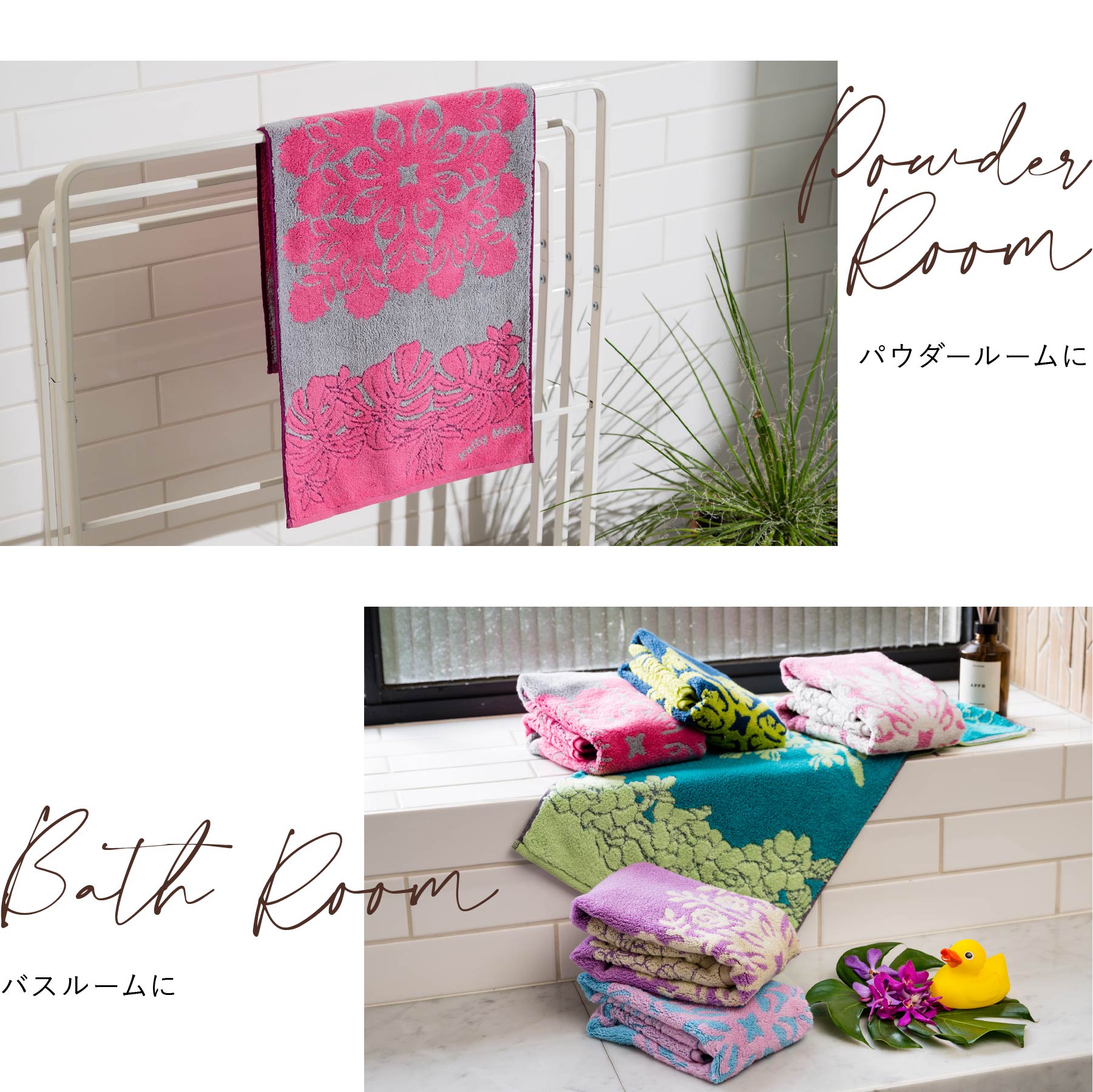 独自の特殊な撚りをかけた光沢感のあるコットンを使用。ソフトな風合いと優れた吸水性を実現しました。 柄の部分は肌ざわりフワフワの無撚糸パイル、背景はさらっとした肌触りの撚糸パイルで、柄を鮮やかに表現しています。 また、柄の一部に「落とし」の技法を加えることで、立体感のある仕上がりになっています。