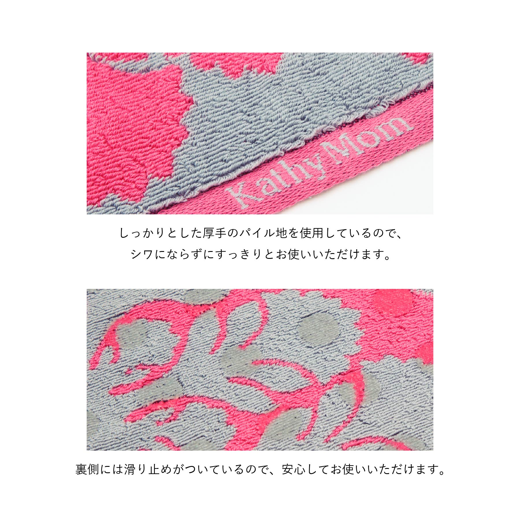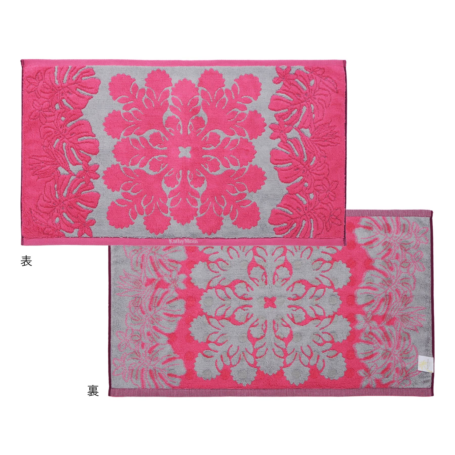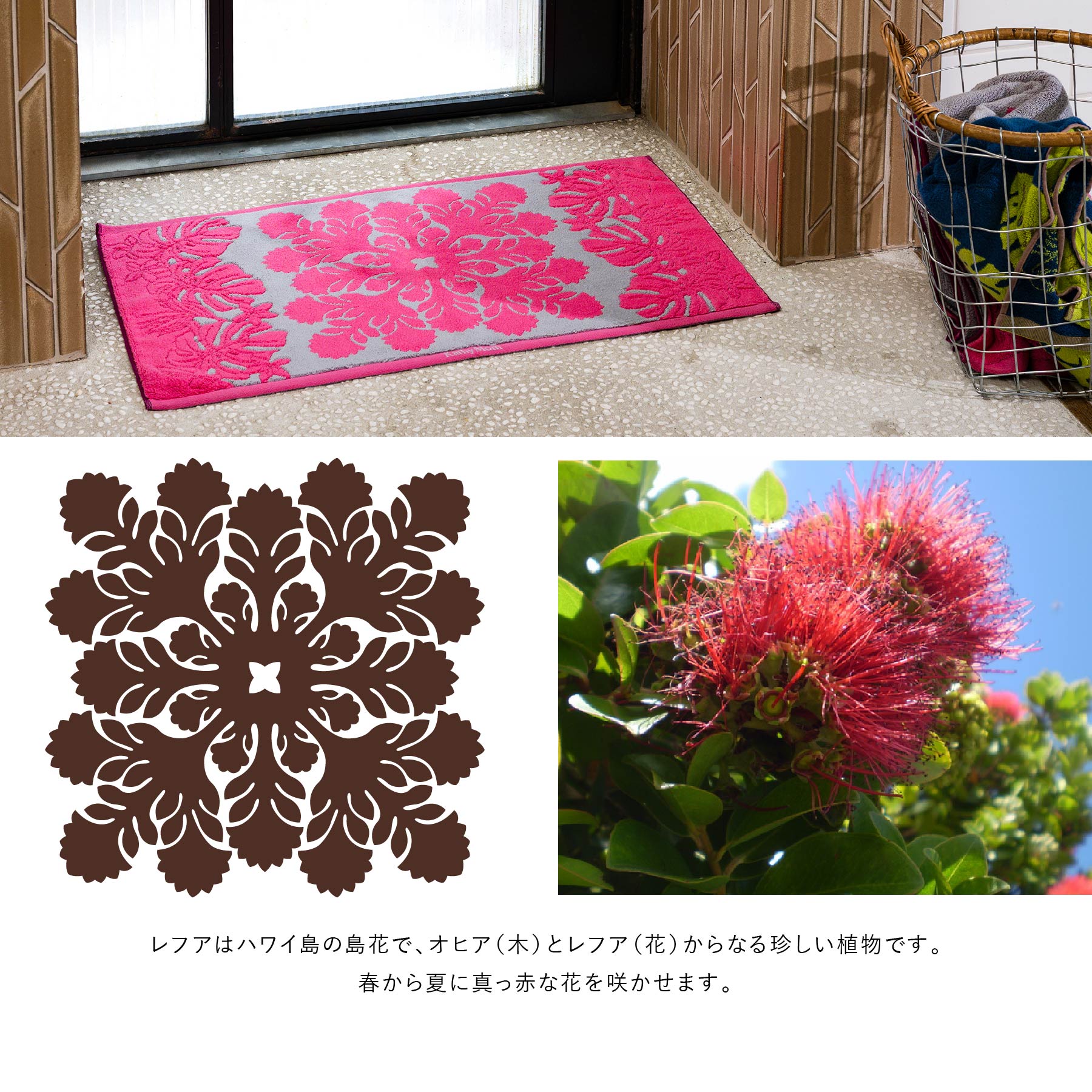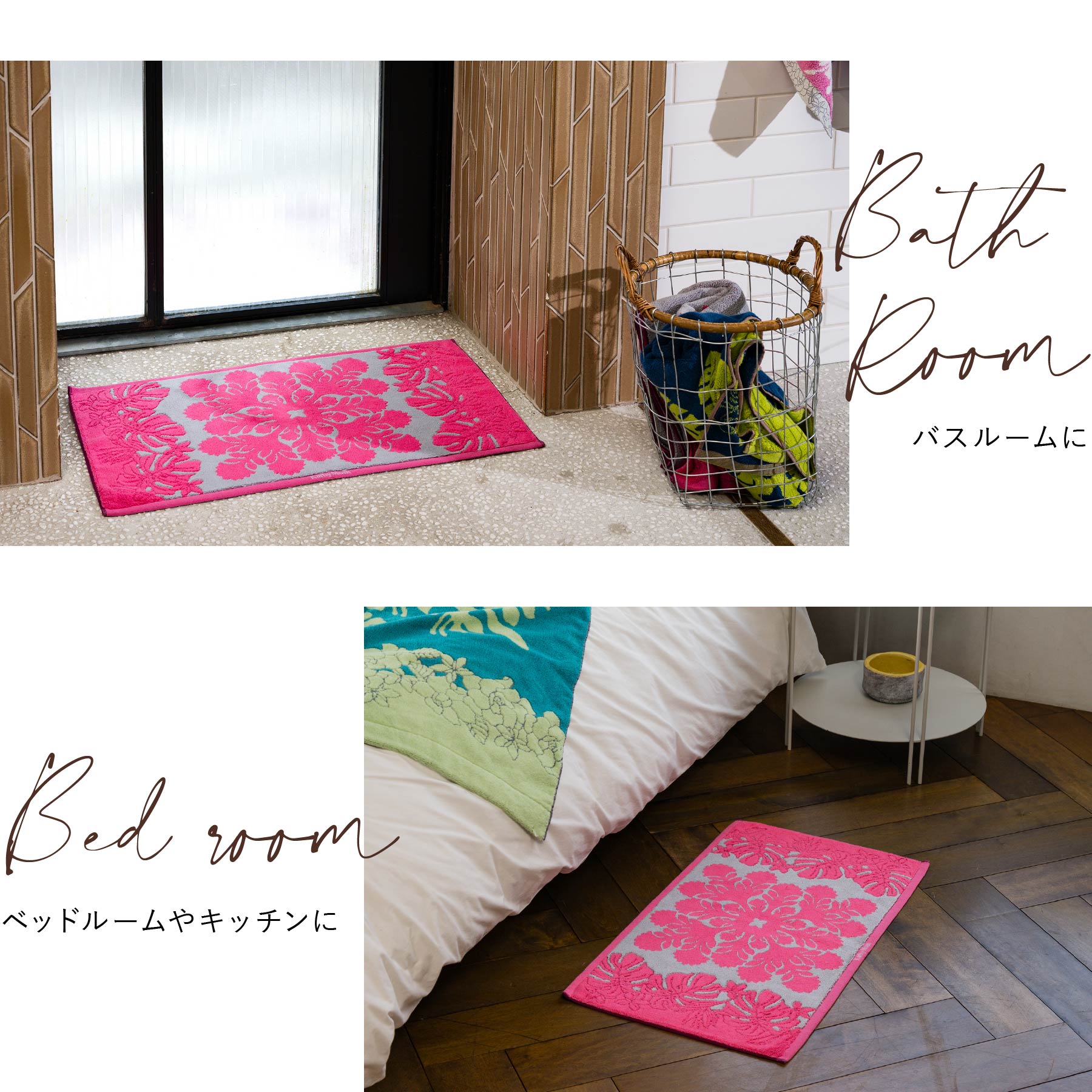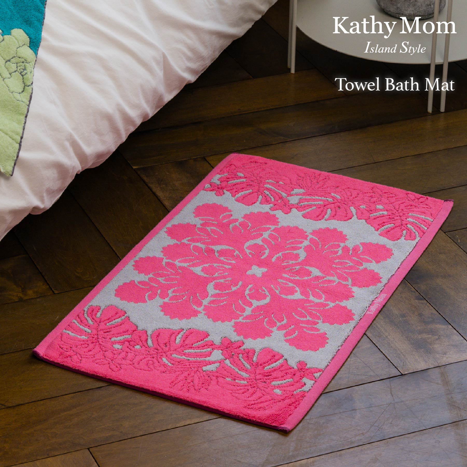 ハワイアンキルト作家、キャシー中島さんプロデュースの、ハワイで愛されている花や植物をデザインした、リゾート感あふれるバスマットです。 しっかりとした厚手のパイル地を使用しているので、シワにならずにすっきりとお使いいただけます。 裏側には滑り止めがついているので、安心してお使いいただけます。 インテリアともマッチするデザインなので、バスルームの他、キッチンマットや玄関マットとしてもご使用いただけます。