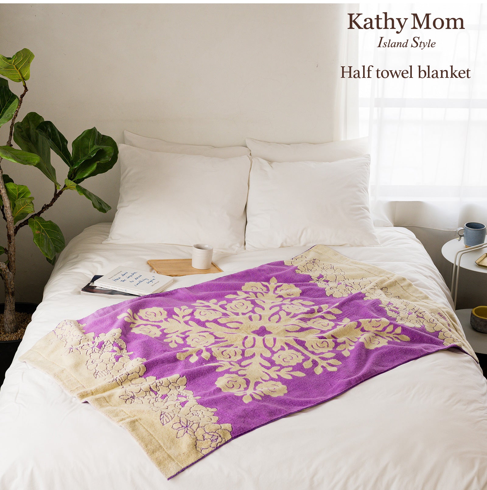 ハワイアンキルト作家、キャシー中島さんプロデュースの、ハワイで愛されている花や植物をデザインした、リゾート感あふれるハーフケットです。