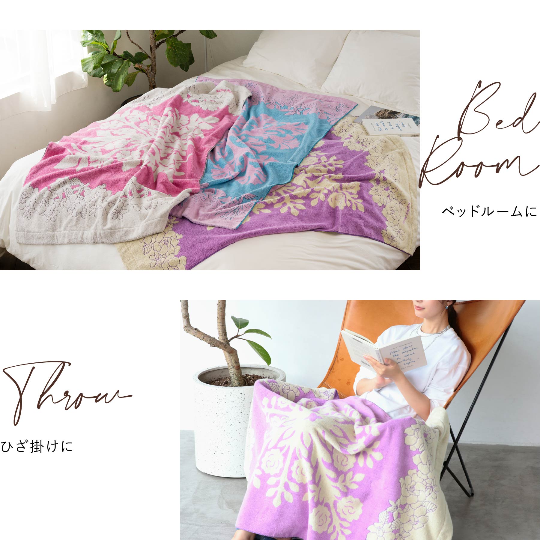 独自の特殊な撚りをかけた光沢感のあるコットンを使用。ソフトな風合いと優れた吸水性を実現しました。 柄の部分は肌ざわりフワフワの無撚糸パイル、背景はさらっとした肌触りの撚糸パイルで、柄を鮮やかに表現しています。 また、柄の一部に「落とし」の技法を加えることで、立体感のある仕上がりになっています。