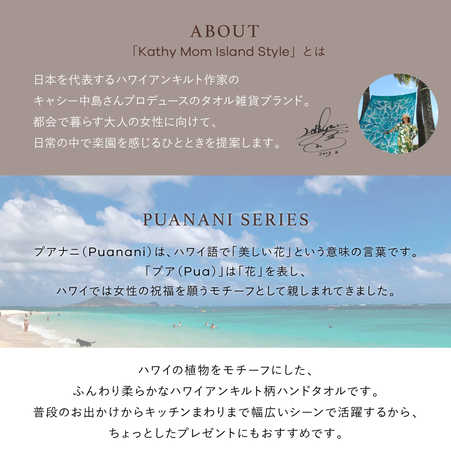 「キャシーマム アイランドスタイル」は、日本を代表するハワイアンキルト作家のキャシー中島さんプロデュースによる、都会で暮らす大人の女性に向けて、日常の中で楽園を感じるひとときを提案するブランドです。