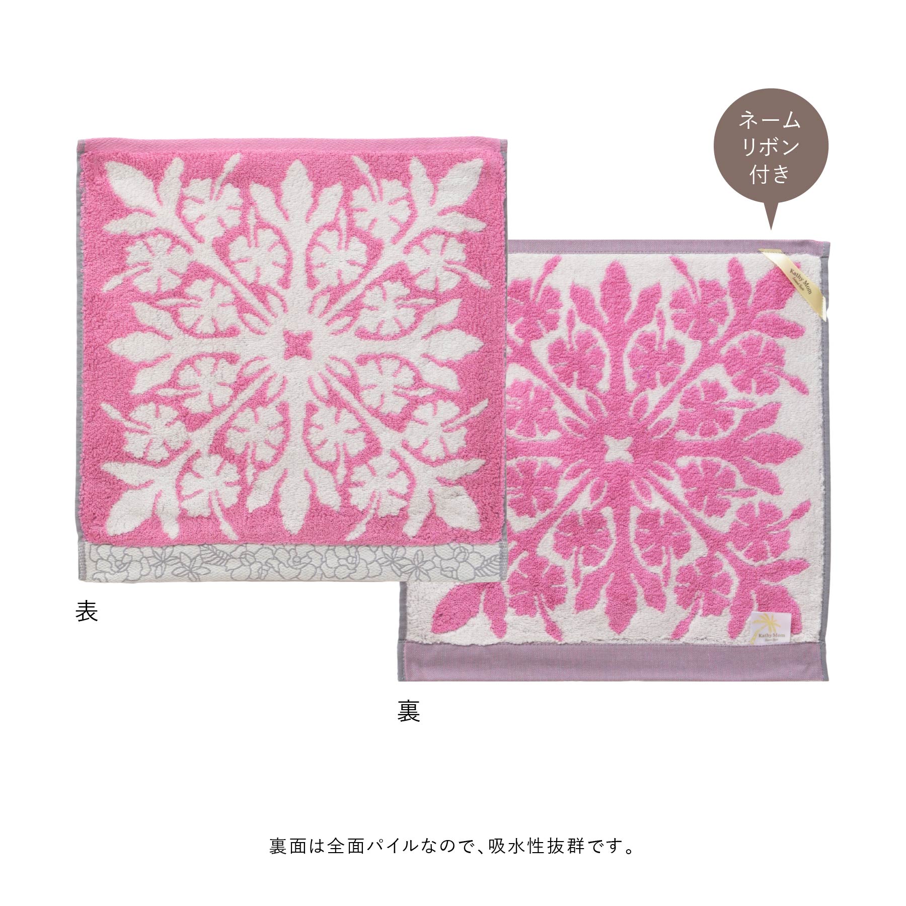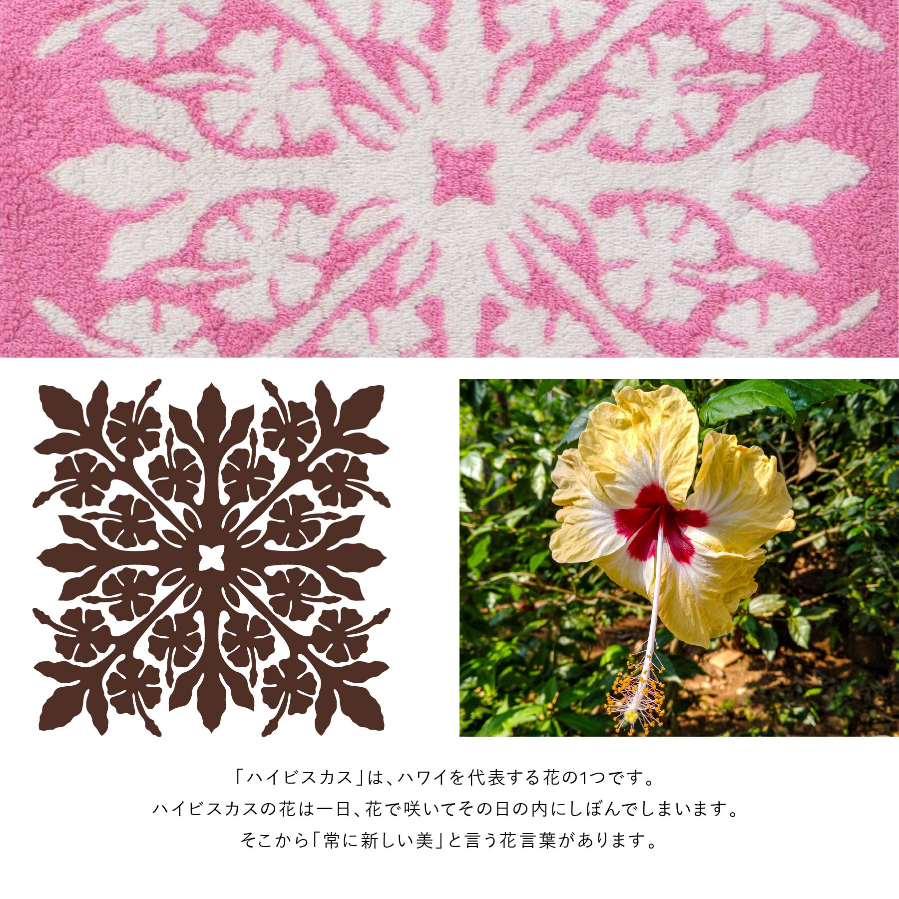 ハワイアンキルト作家、キャシー中島さんプロデュースの、ハワイの代表的な植物をモチーフにした、ふんわり柔らかなハワイアンキルト柄ハンドタオルです。