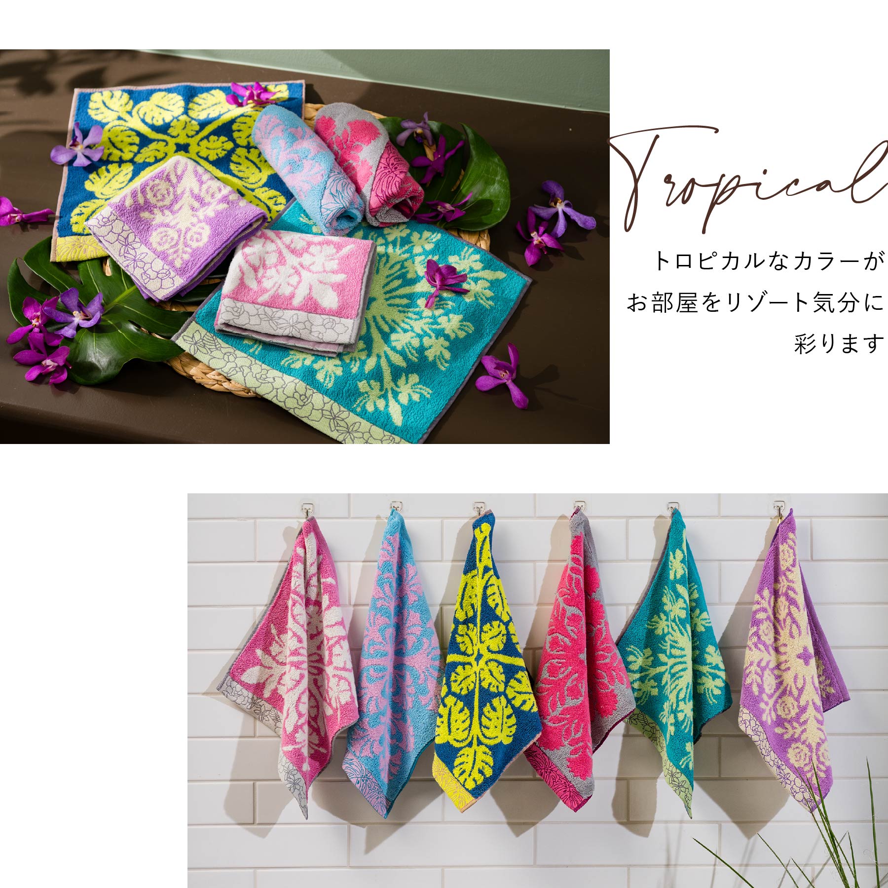 独自の特殊な撚りをかけた光沢感のあるコットンを使用。ソフトな風合いと優れた吸水性を実現しました。 柄の部分は肌ざわりフワフワの無撚糸パイル、背景はさらっとした肌触りの撚糸パイルで、柄を鮮やかに表現しています。