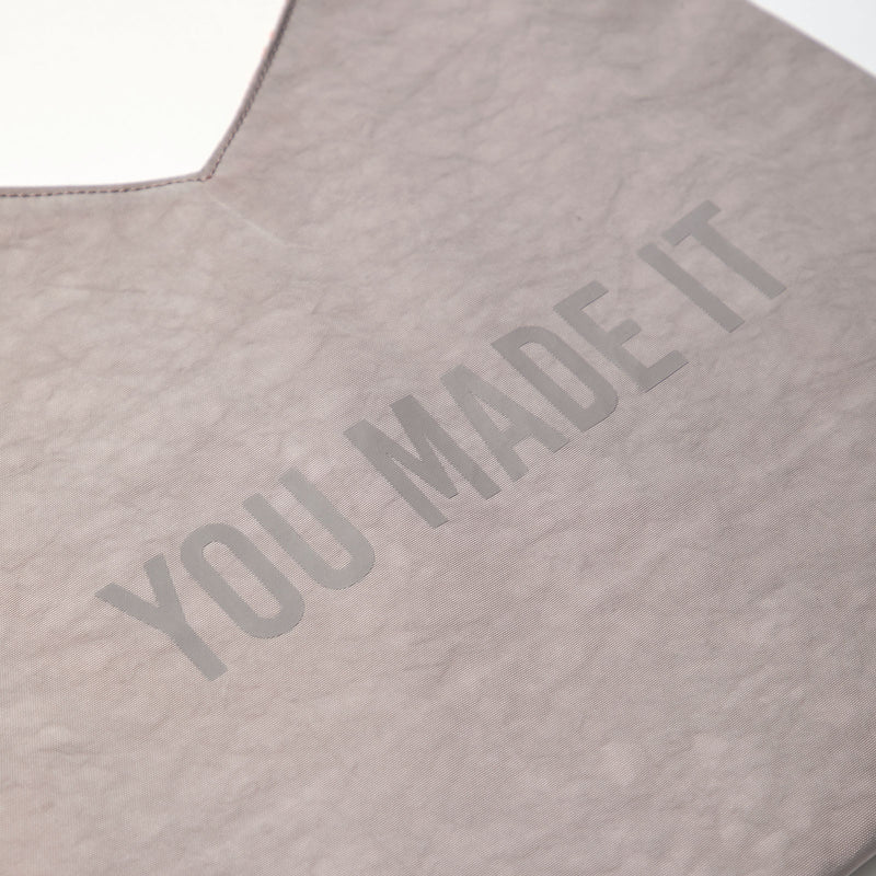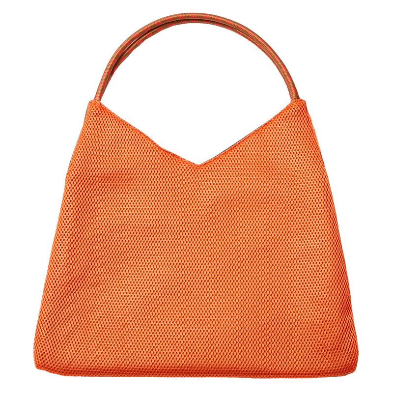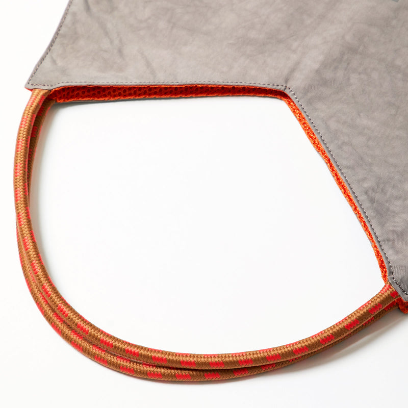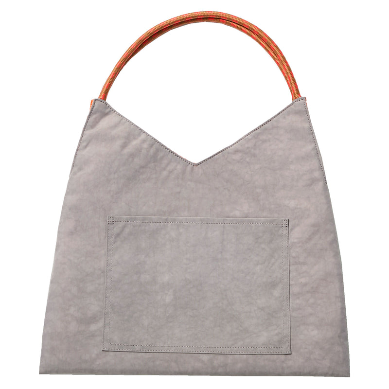 開口部のV字はデザイン性だけでなく、肩掛け時にゆとりを持たせ使いやすいです。 リバーシブルでお使いいただけるトートバッグです。肩の凝らない軽量さがポイントで、持ち手のカラフルなドローコードがアクセントになっています。