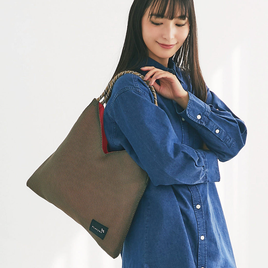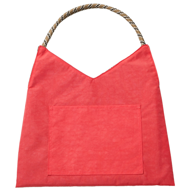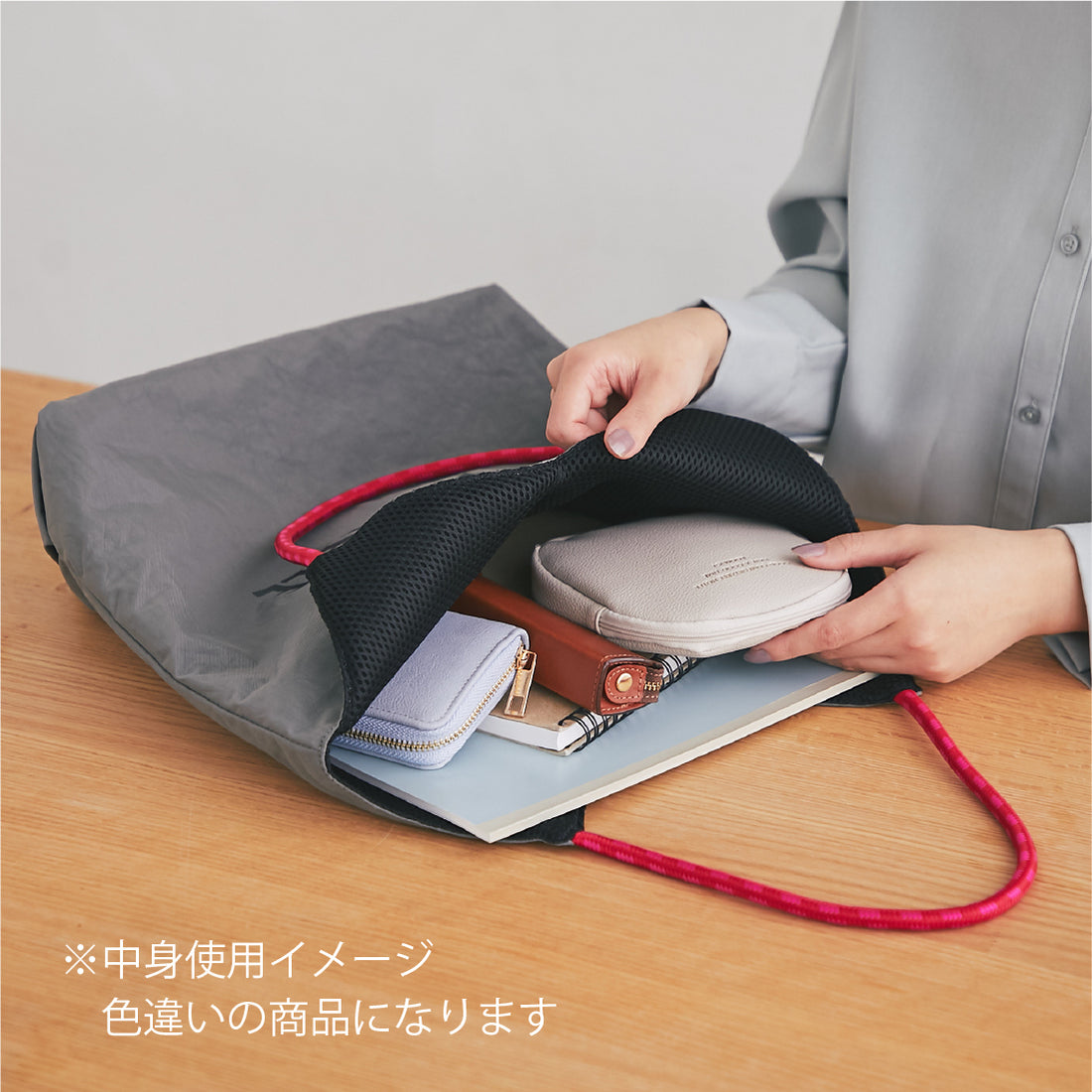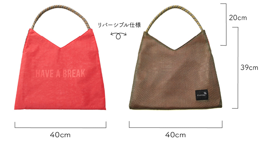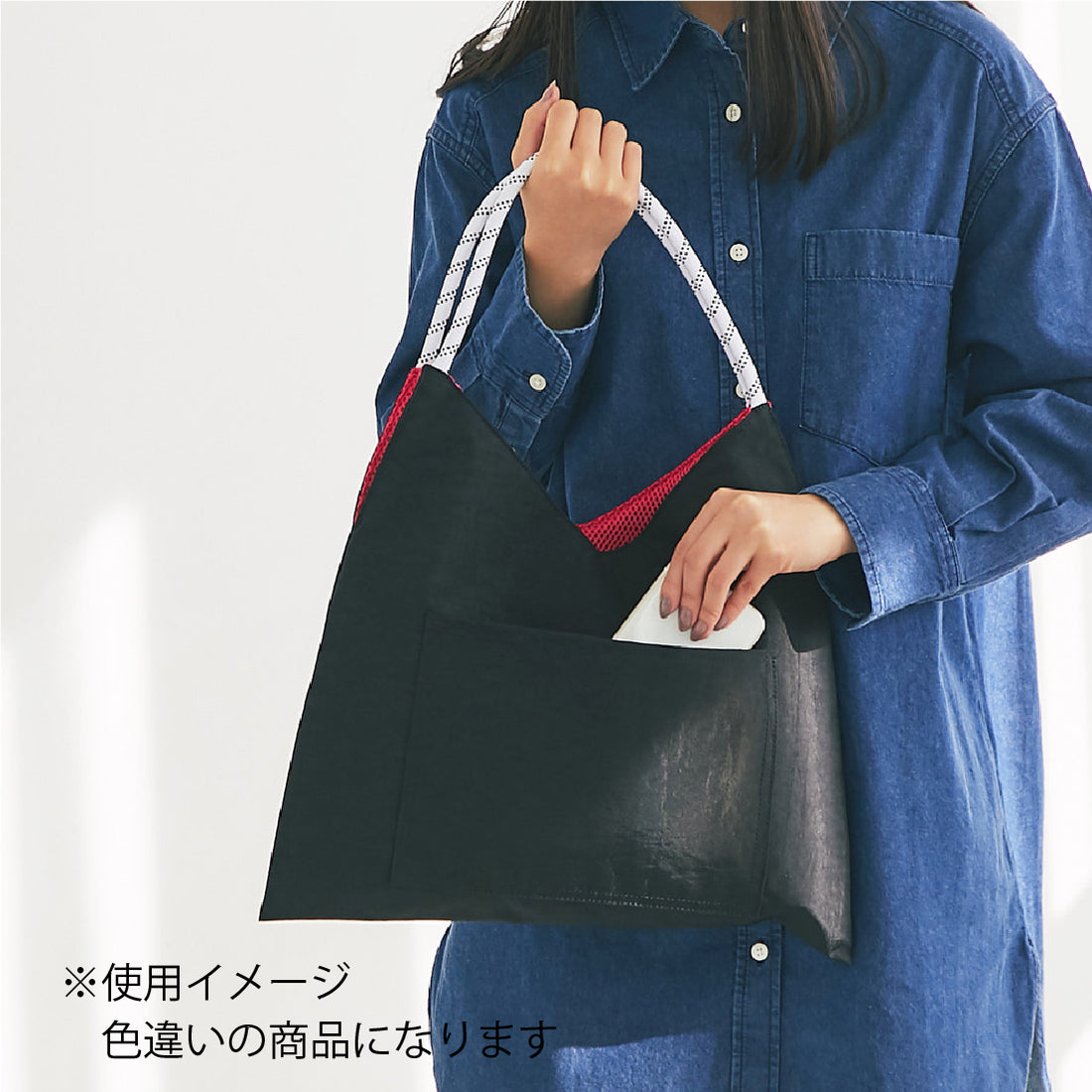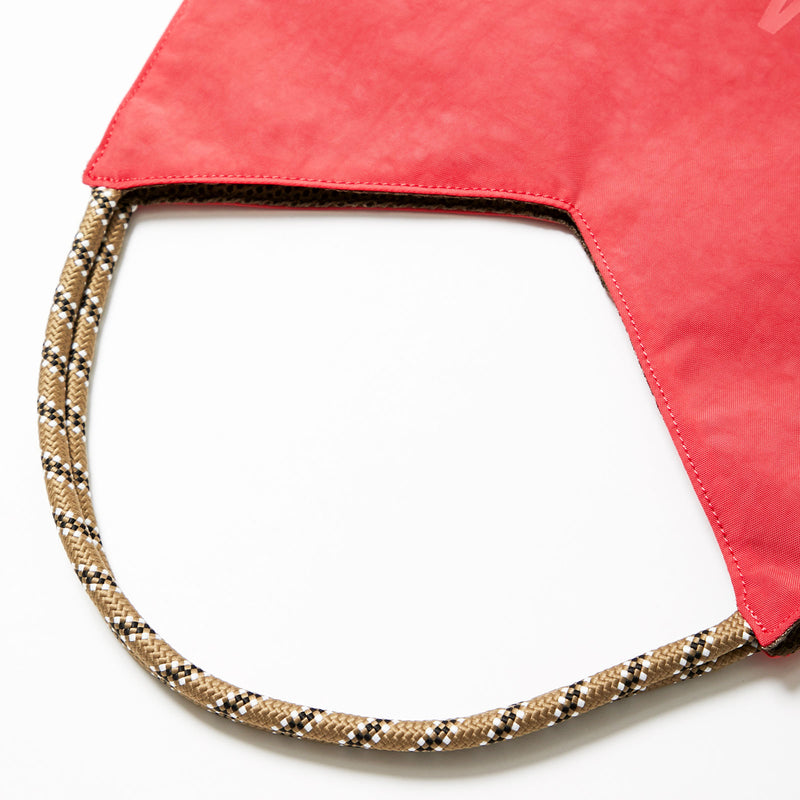 開口部のV字はデザイン性だけでなく、肩掛け時にゆとりを持たせ使いやすいです。 リバーシブルでお使いいただけるトートバッグです。肩の凝らない軽量さがポイントで、持ち手のカラフルなドローコードがアクセントになっています。