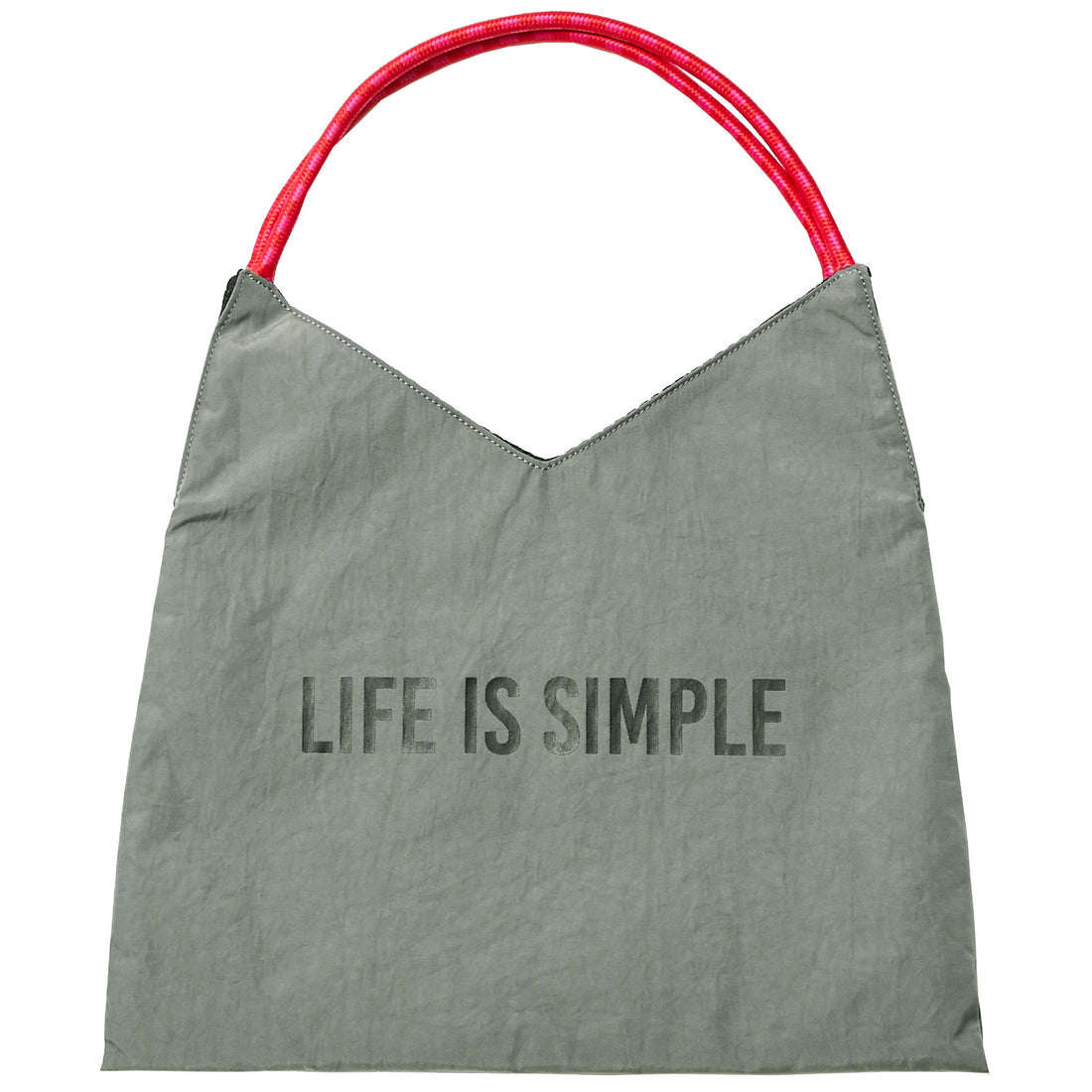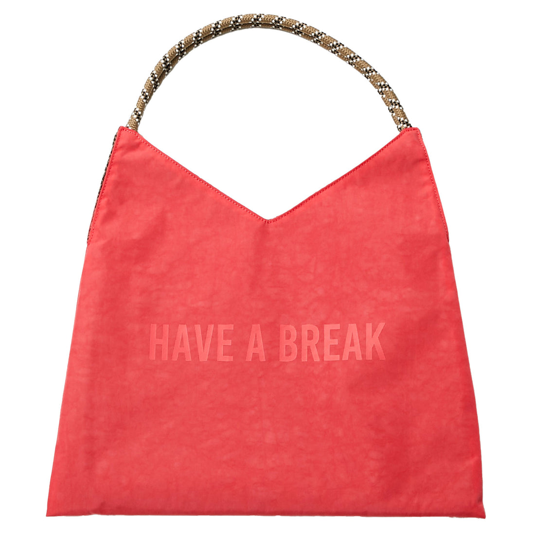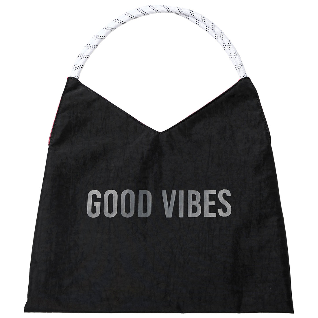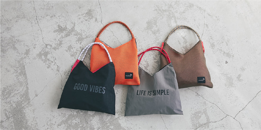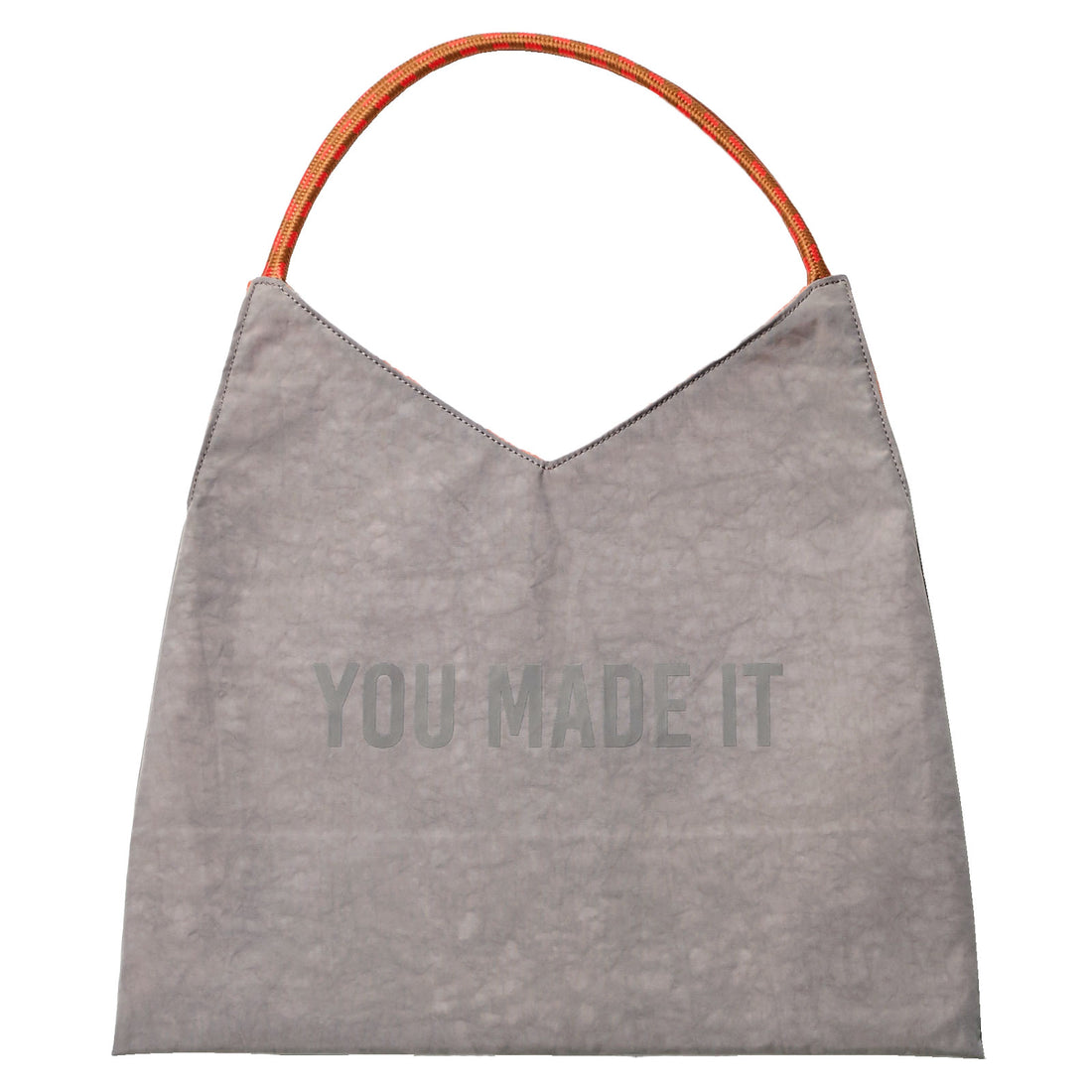 開口部のV字はデザイン性だけでなく、肩掛け時にゆとりを持たせ使いやすいです。 リバーシブルでお使いいただけるトートバッグです。肩の凝らない軽量さがポイントで、持ち手のカラフルなドローコードがアクセントになっています。