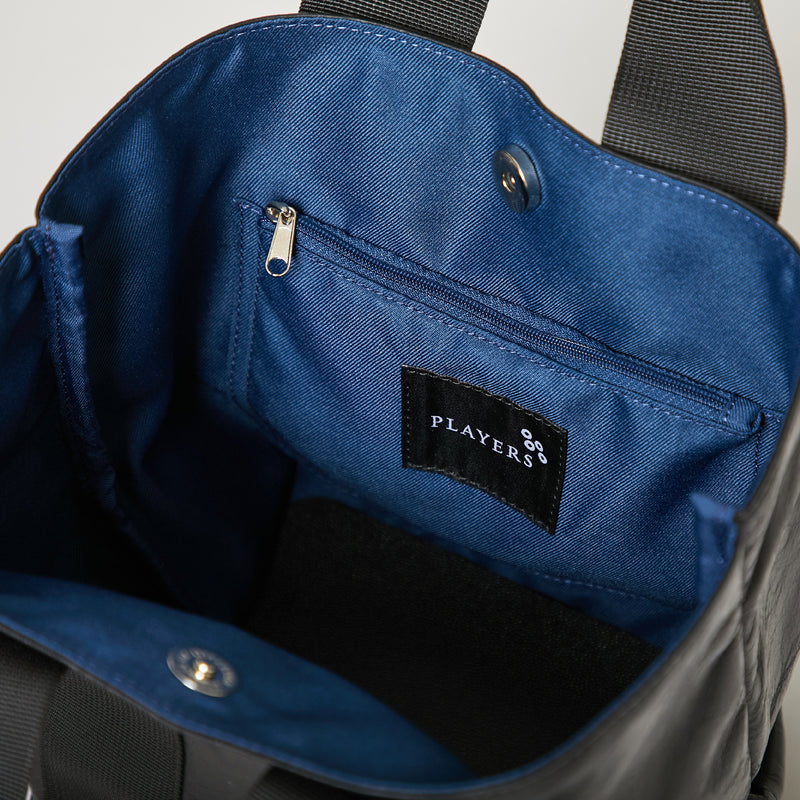 インナーカラーはきりっとハンサムなネイビー。 開口部はマグネット式のスナップボタン付きで荷物の飛び出しを防げます。 パスケースやカードケースが入るサイズのファスナーポケットもついているので、貴重品はこちらへ。 底板がついているので物が少ないときも形をキープできます。