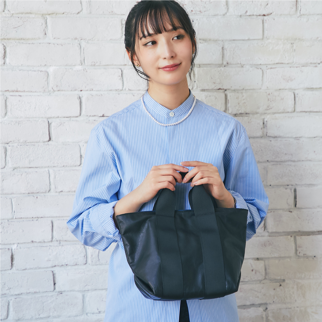 ちらっと覗く裏地の配色がコーディネートのポイントになります。見た目以上の収納力で長財布やポーチなどお出かけの必需品に加え、ペットボトルや折り畳み傘なども収まる見た目以上の収納力です。