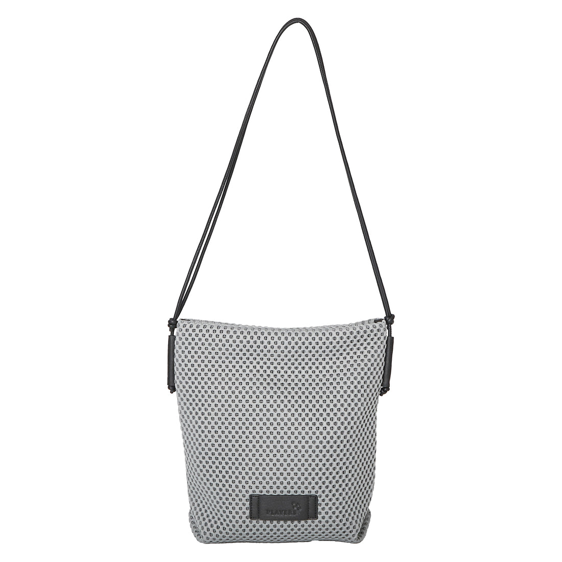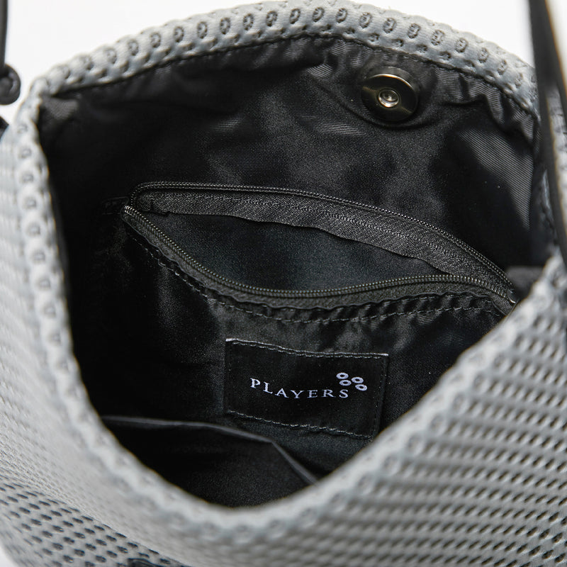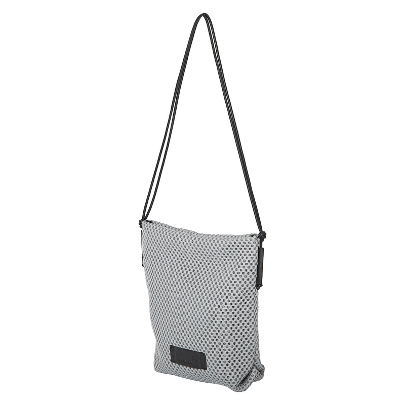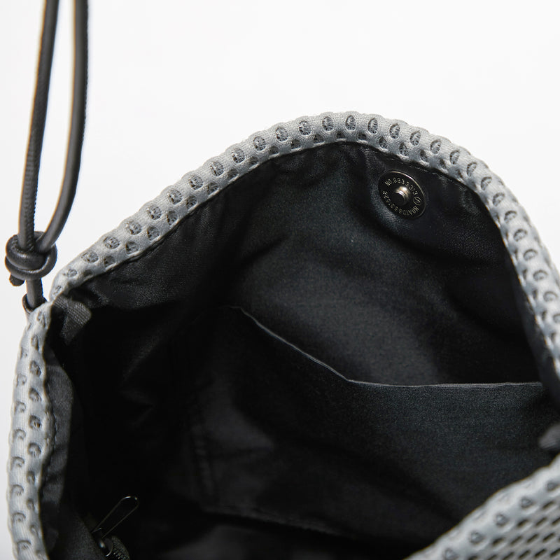 エアメッシュの生地に合皮のロープがスポーティーなショルダーバック。 開閉はスナップボタンで簡単に物の出し入れが可能です。 内部にはオープンポケットとファスナーポケットがあり小物の仕分けに便利です。