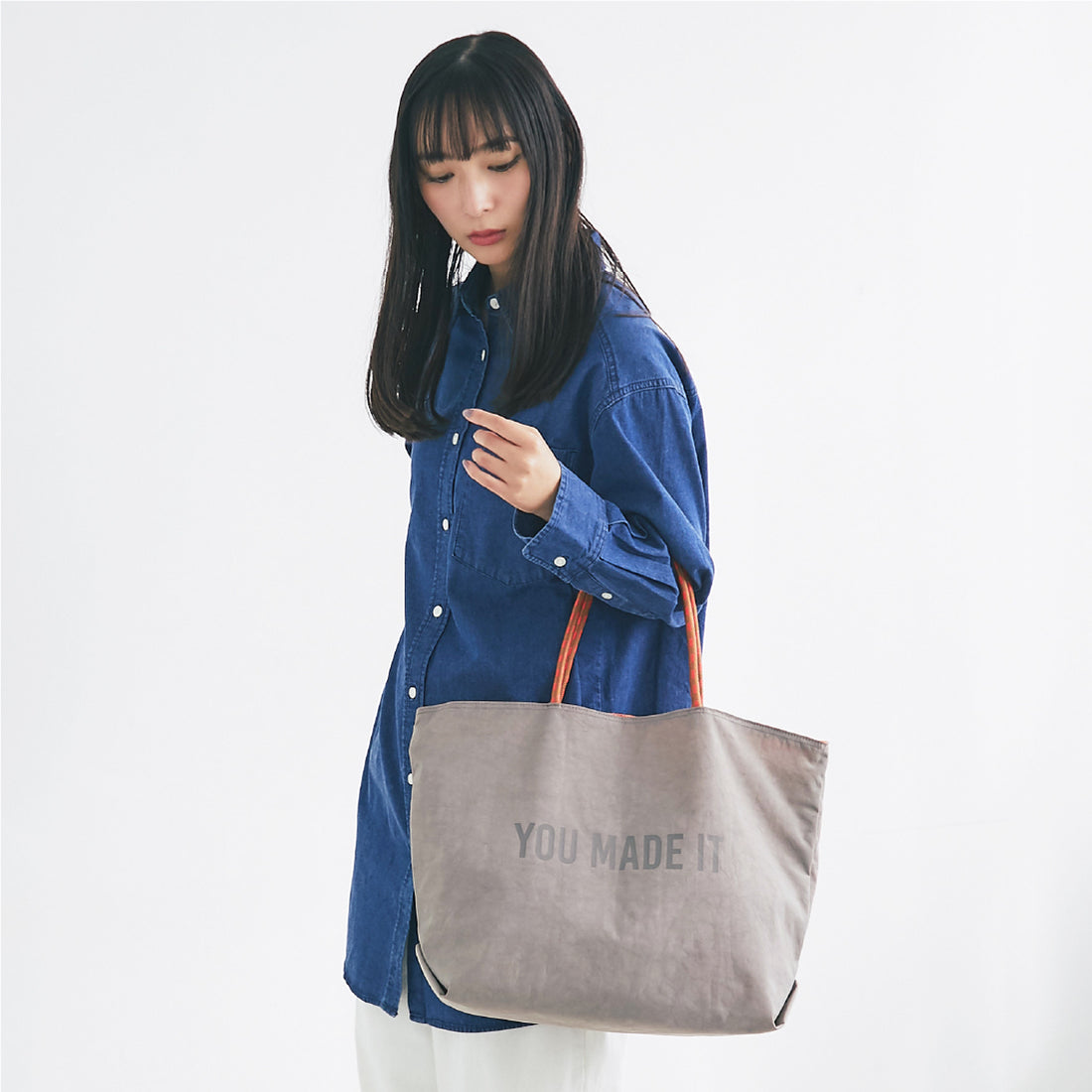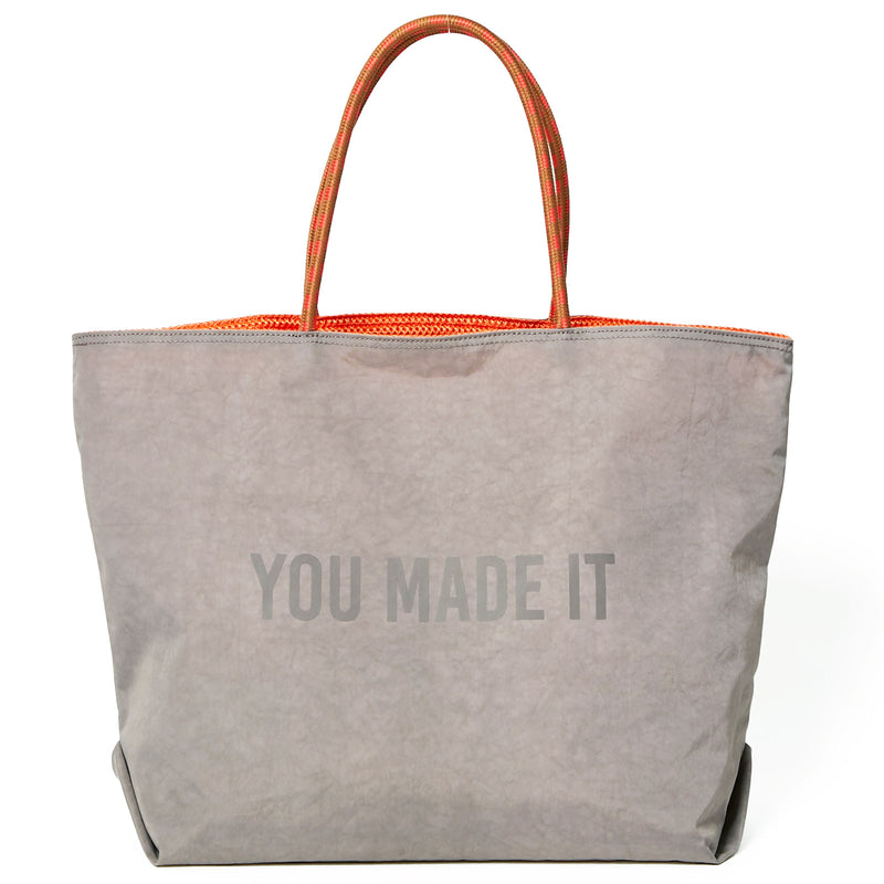 ハリのあるナイロン生地を使用。 ヴィンテージライクなベージュに、ちらりと見える内側のオレンジやハンドルがアクセントに。 メッセージは "YOU MADE IT"(やったね!)