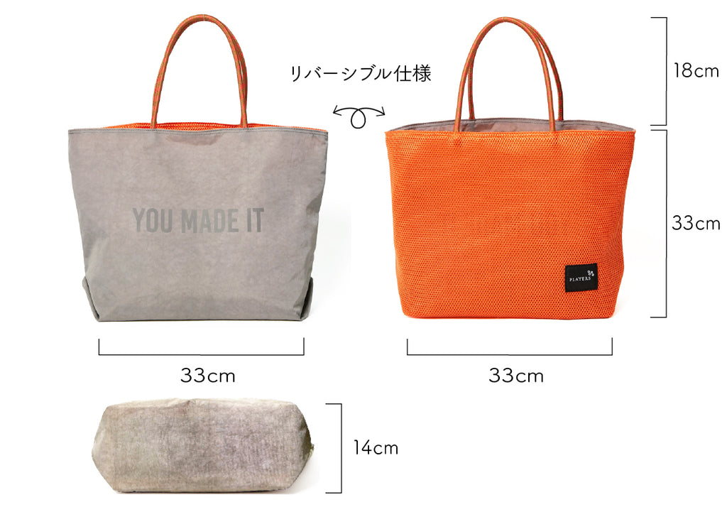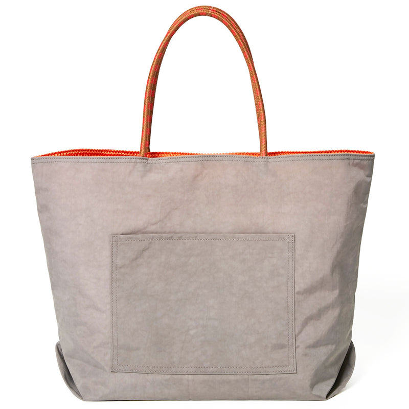 リバーシブルでお使いいただけるトートバッグです。肩の凝らない軽量さがポイントで、持ち手のカラフルなドローコードがアクセントになっています。表裏で素材感を変えているのでコーディネートやシチュエーションで使い分けが出来ます。
