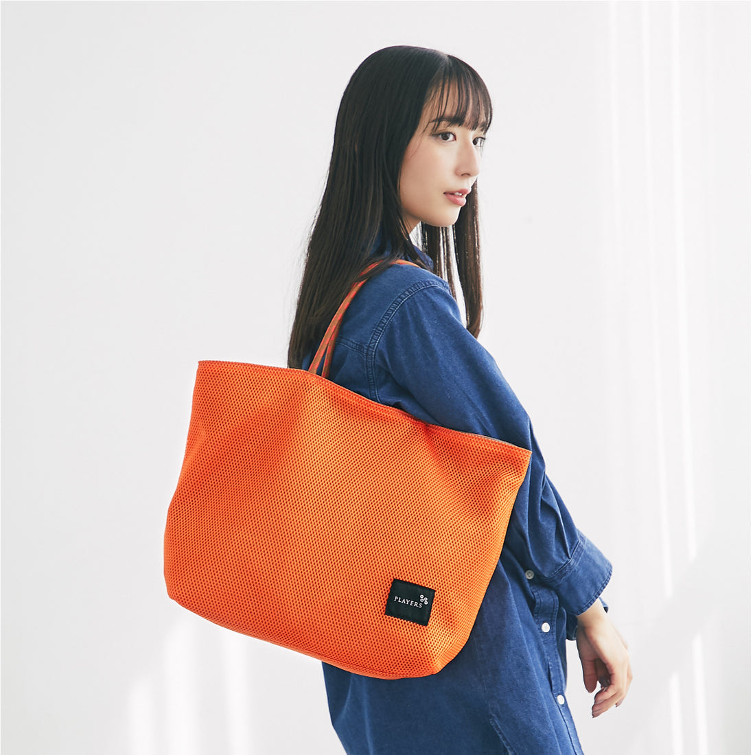 元気がわいてくるポップなオレンジ。 黒のブランドタグもポイント。 シーンやコーディネートに合わせて使い分けて。