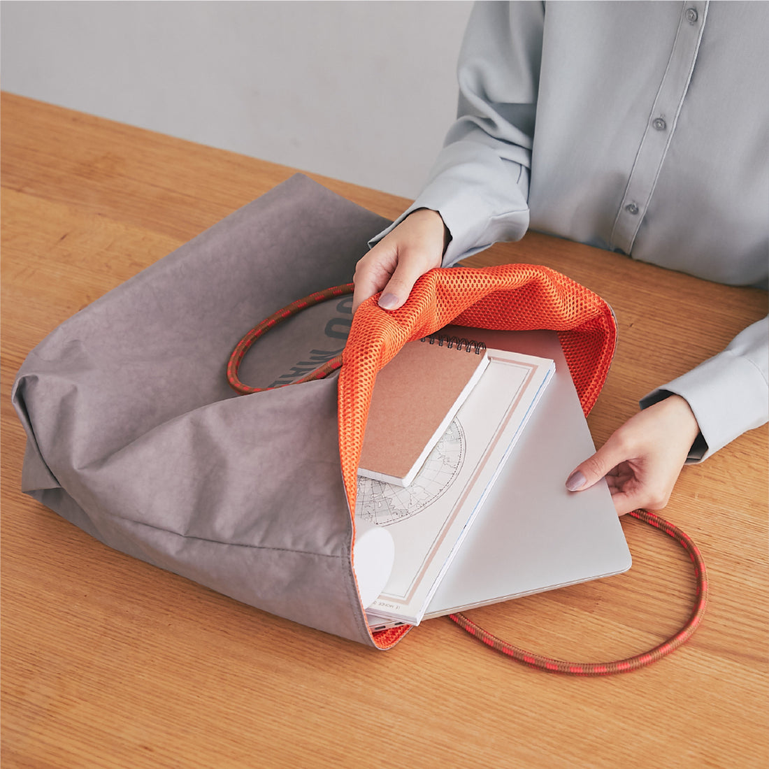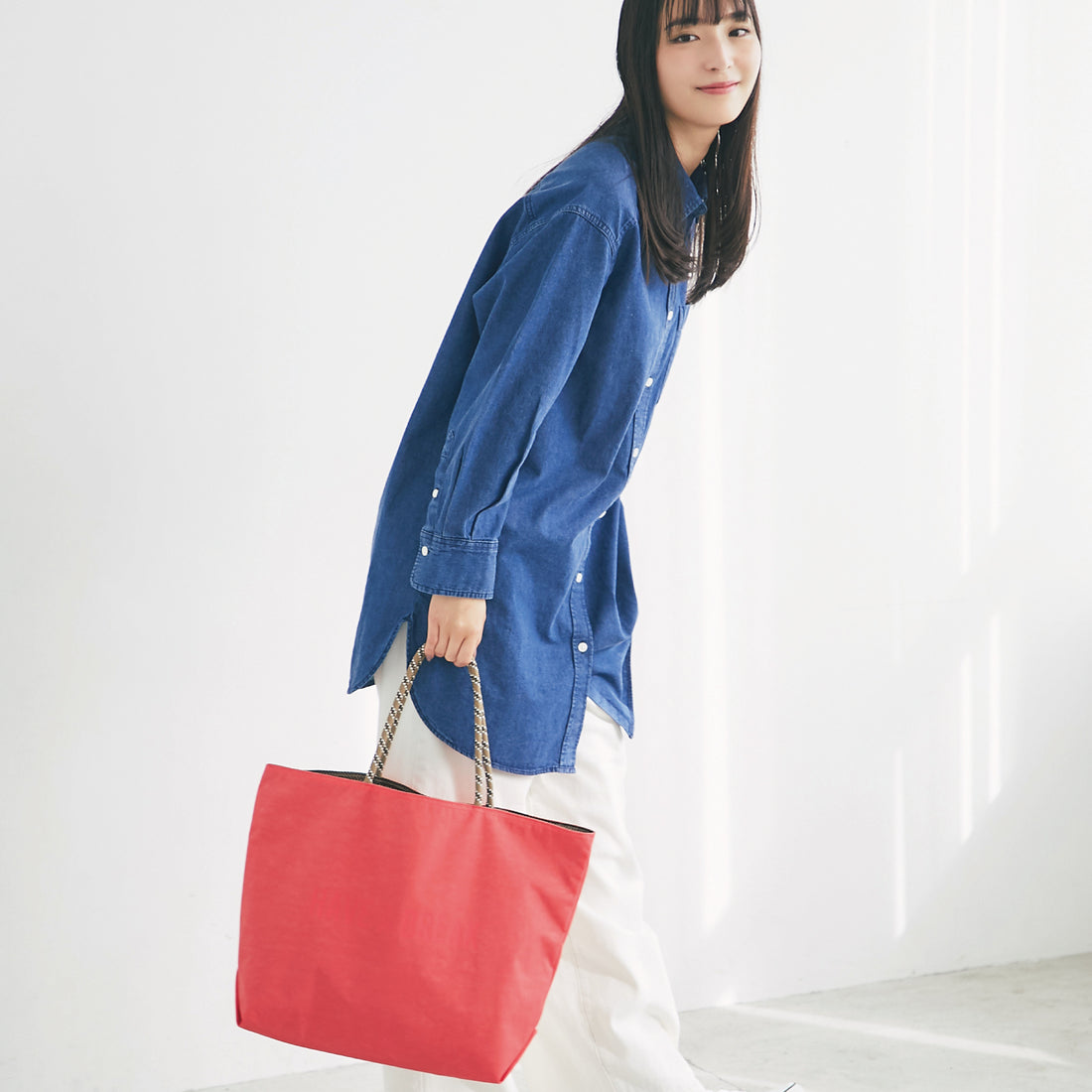 リバーシブルでお使いいただけるトートバッグです。肩の凝らない軽量さがポイントで、持ち手のカラフルなドローコードがアクセントになっています。表裏で素材感を変えているのでコーディネートやシチュエーションで使い分けが出来ます。