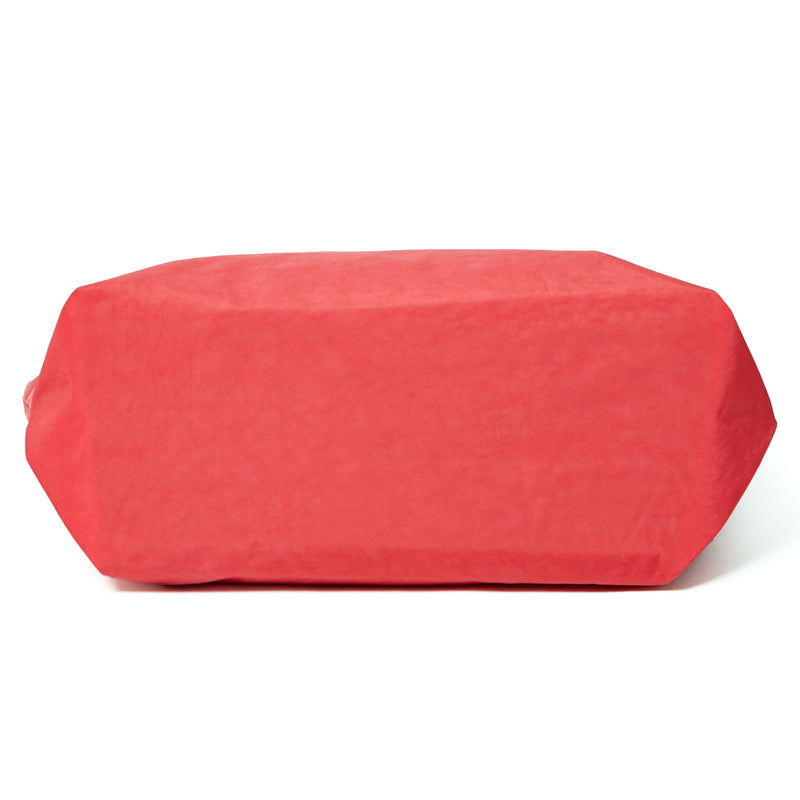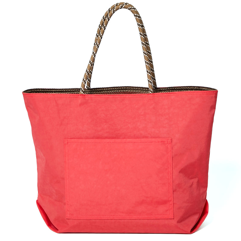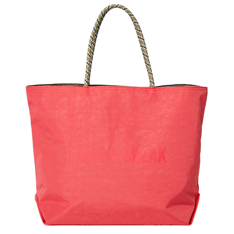 ハリのあるナイロン生地を使用。 合わせやすい赤みのピンクに同色でさりげなくロゴをプリント。 メッセージは "HAVE A BREAK"(一休み)