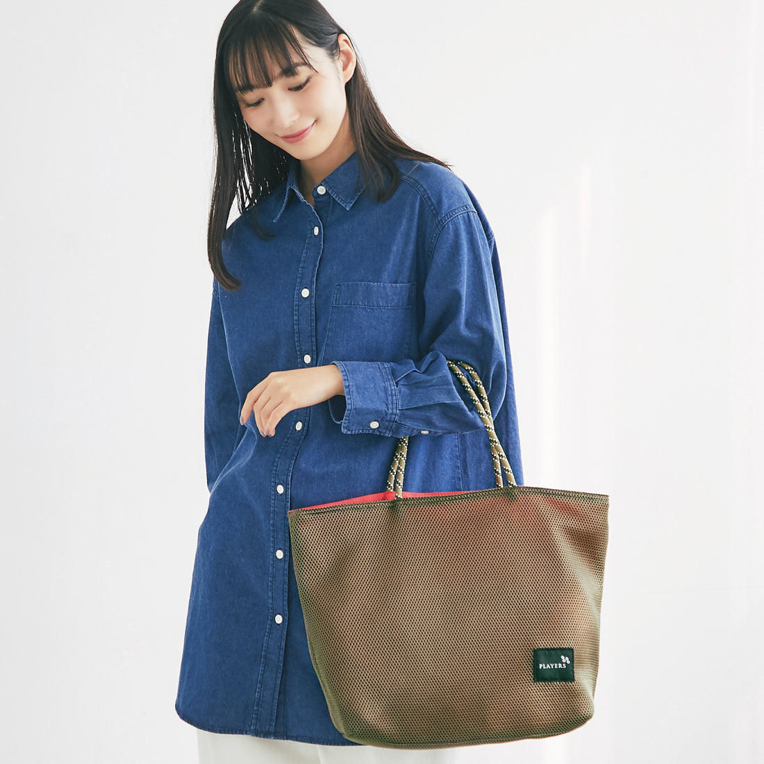 合わせやすいブラウンをエアメッシュ素材で軽やかに。 ブラックのネームタグもポイント。 シーンやコーディネートに合わせて使い分けて。