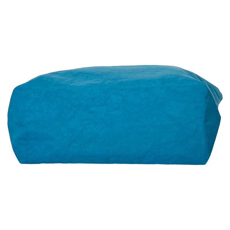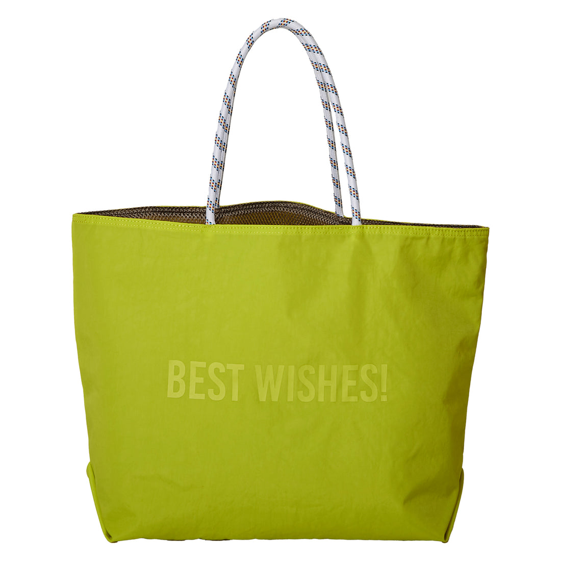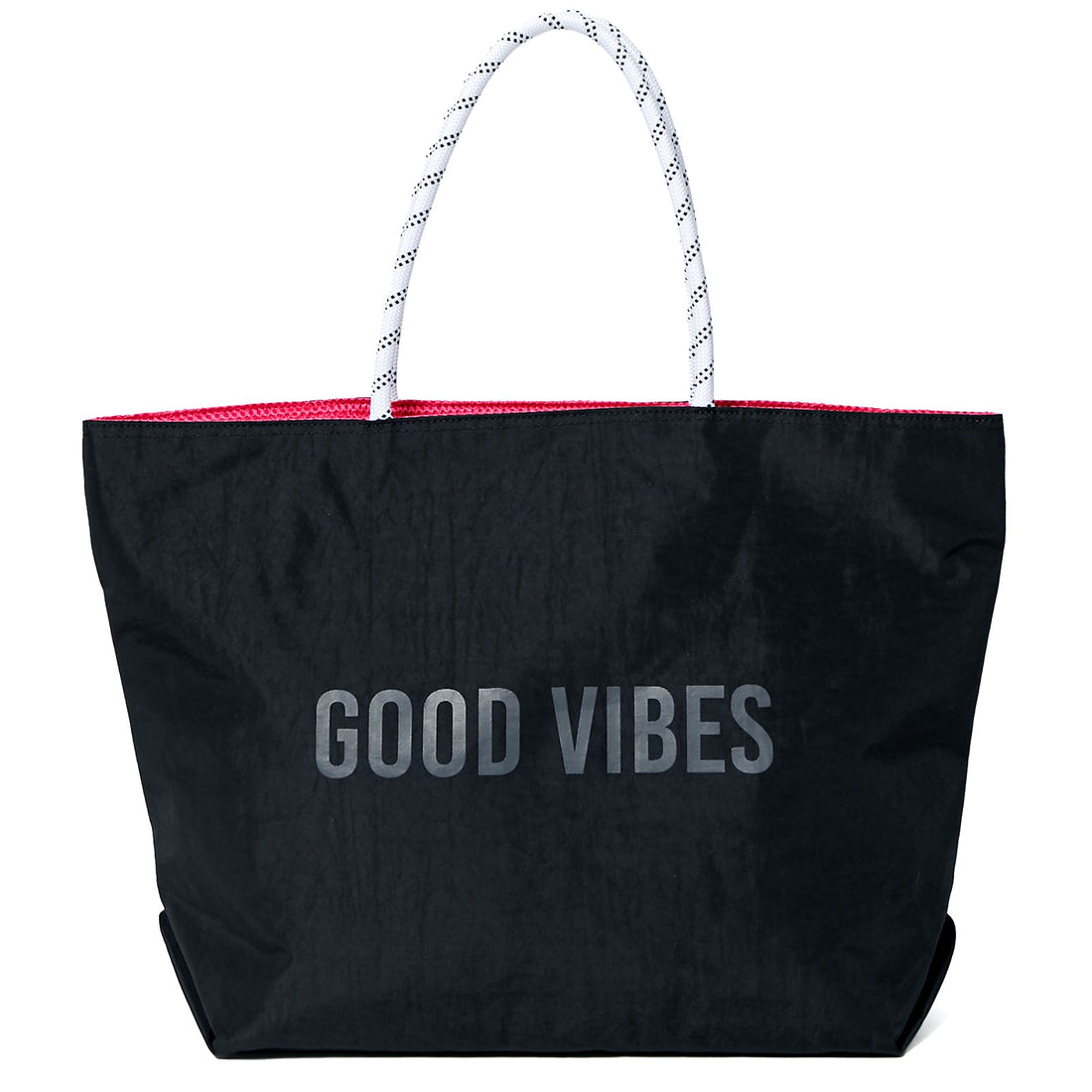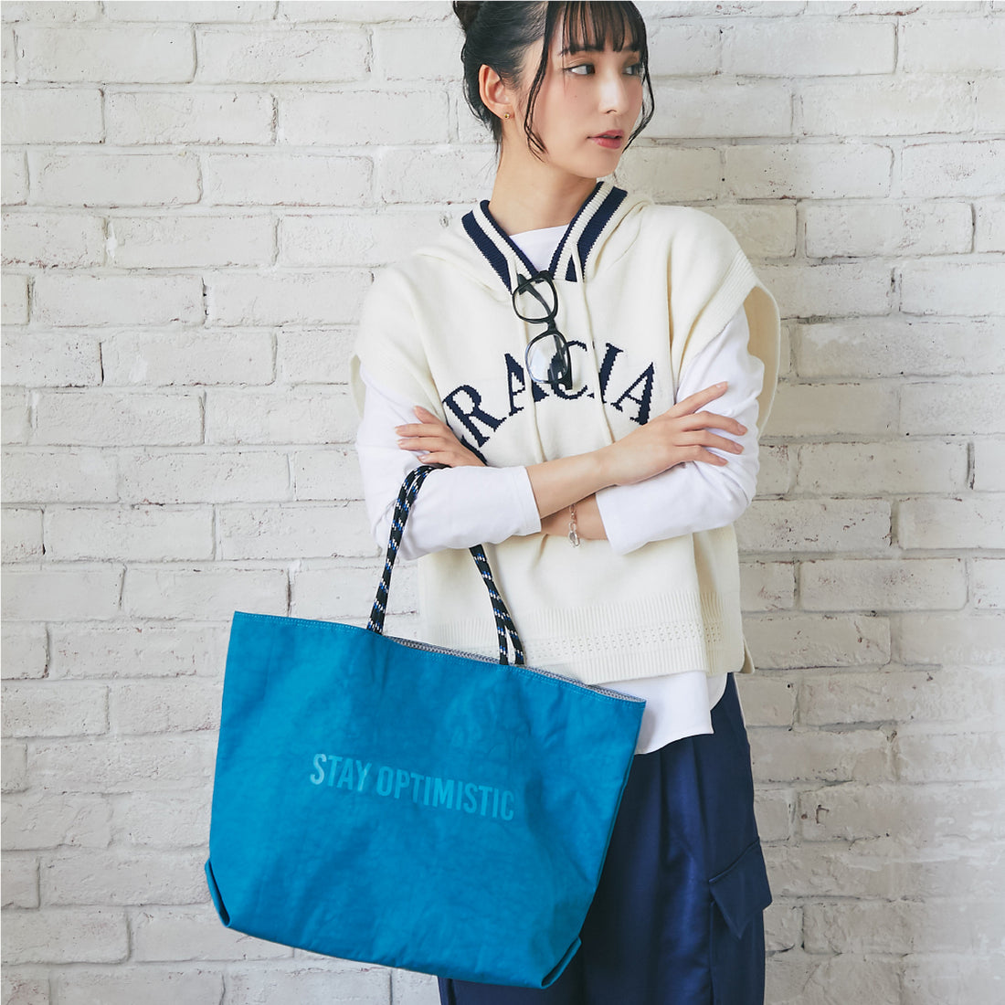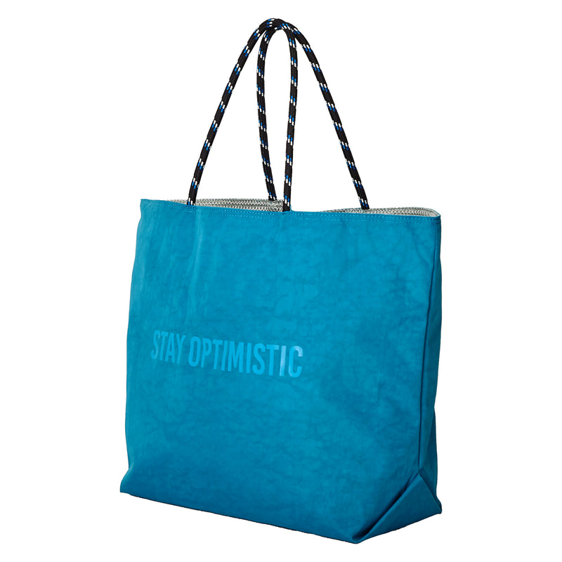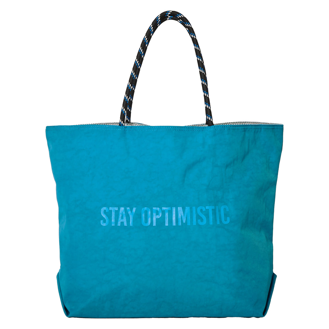 ハリのあるナイロン生地を使用。 鮮やかなブルーが春夏にぴったり。 メッセージは "STAY OPTIMISTIC"(楽観的にいこう)