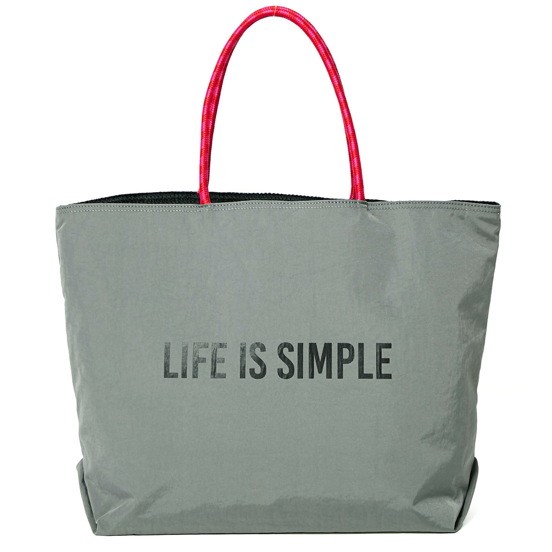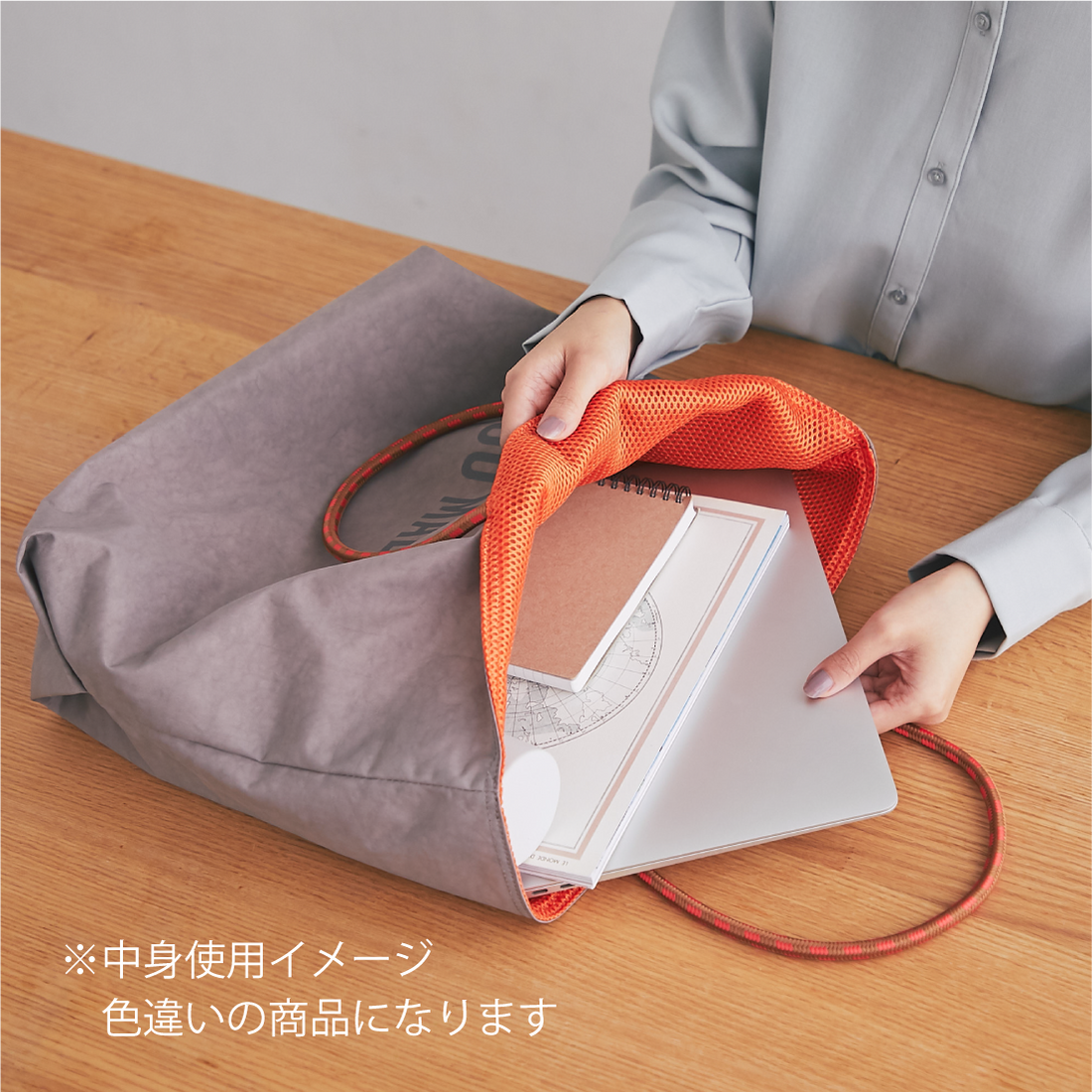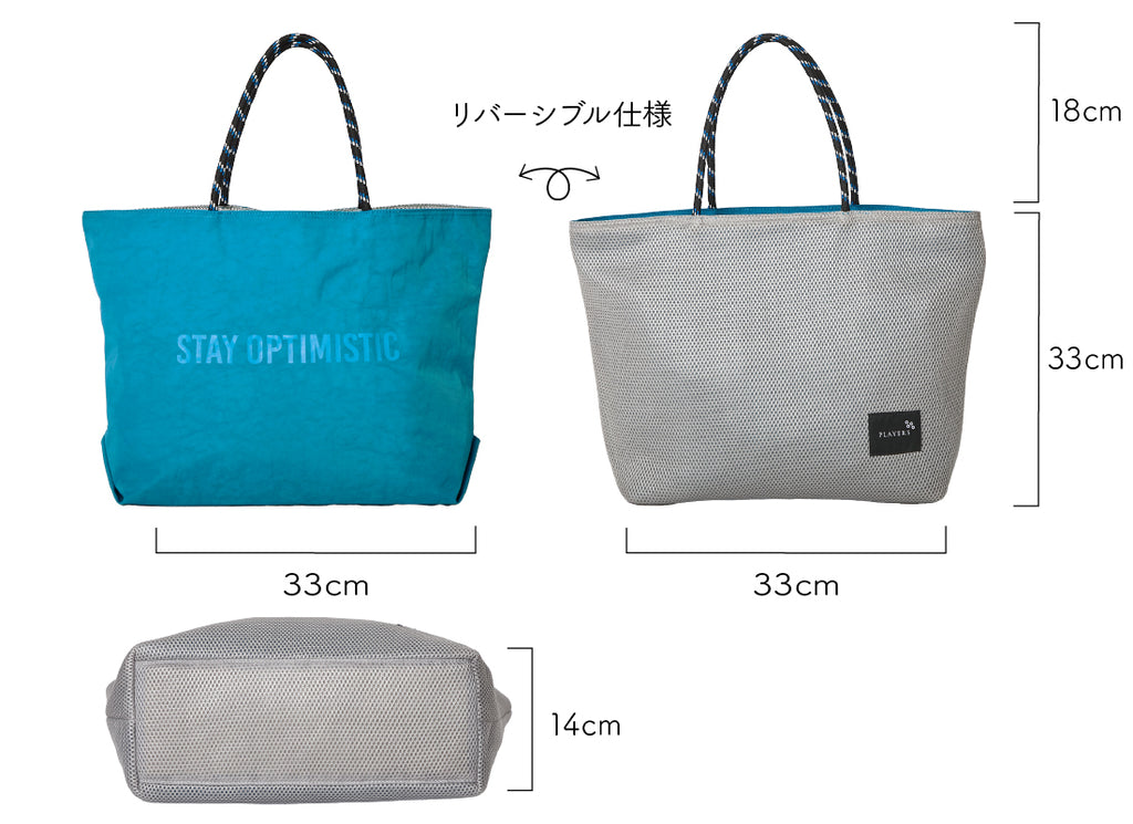 >リバーシブルでお使いいただけるトートバッグです。肩の凝らない軽量さがポイントで、持ち手のカラフルなドローコードがアクセントになっています。表裏で素材感を変えているのでコーディネートやシチュエーションで使い分けが出来ます。