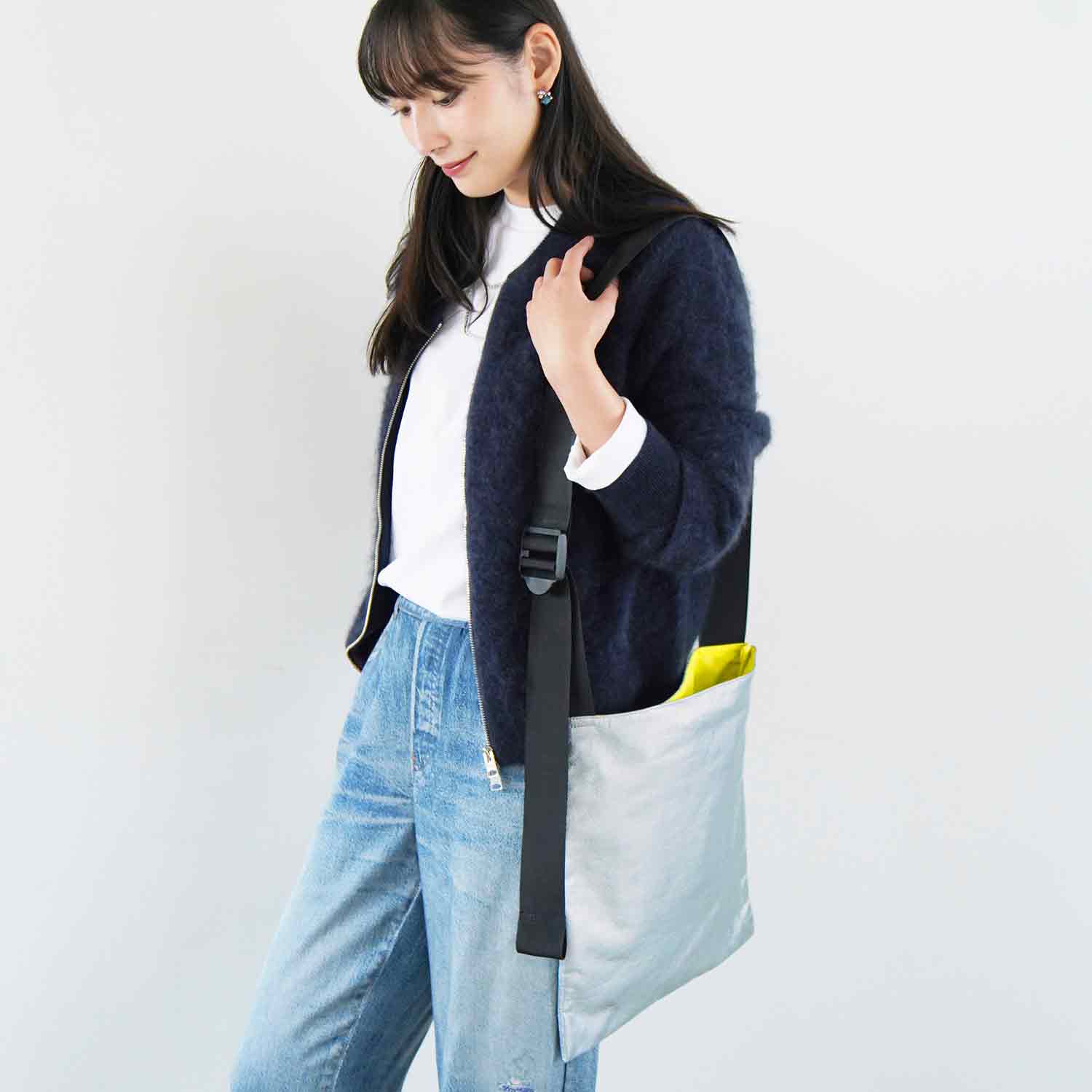 使用しているベルトは約5cmと幅が広く、荷物をたくさん入れても肩に負担がかかりにくいタイプ。バッグは縦長の形となっており、A4サイズもしっかり入ります。