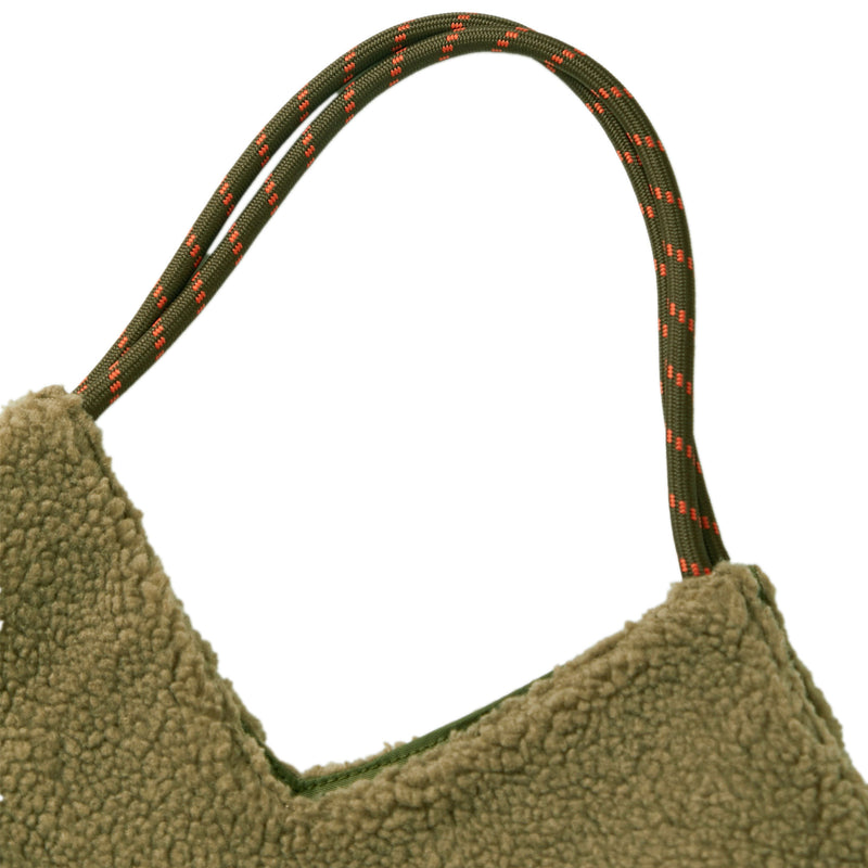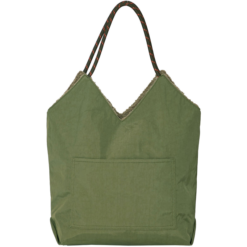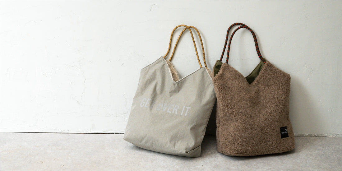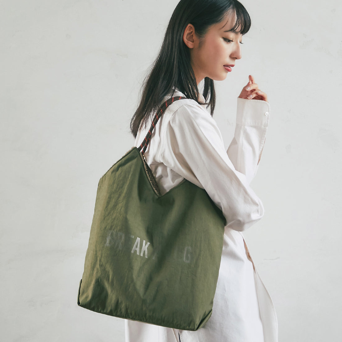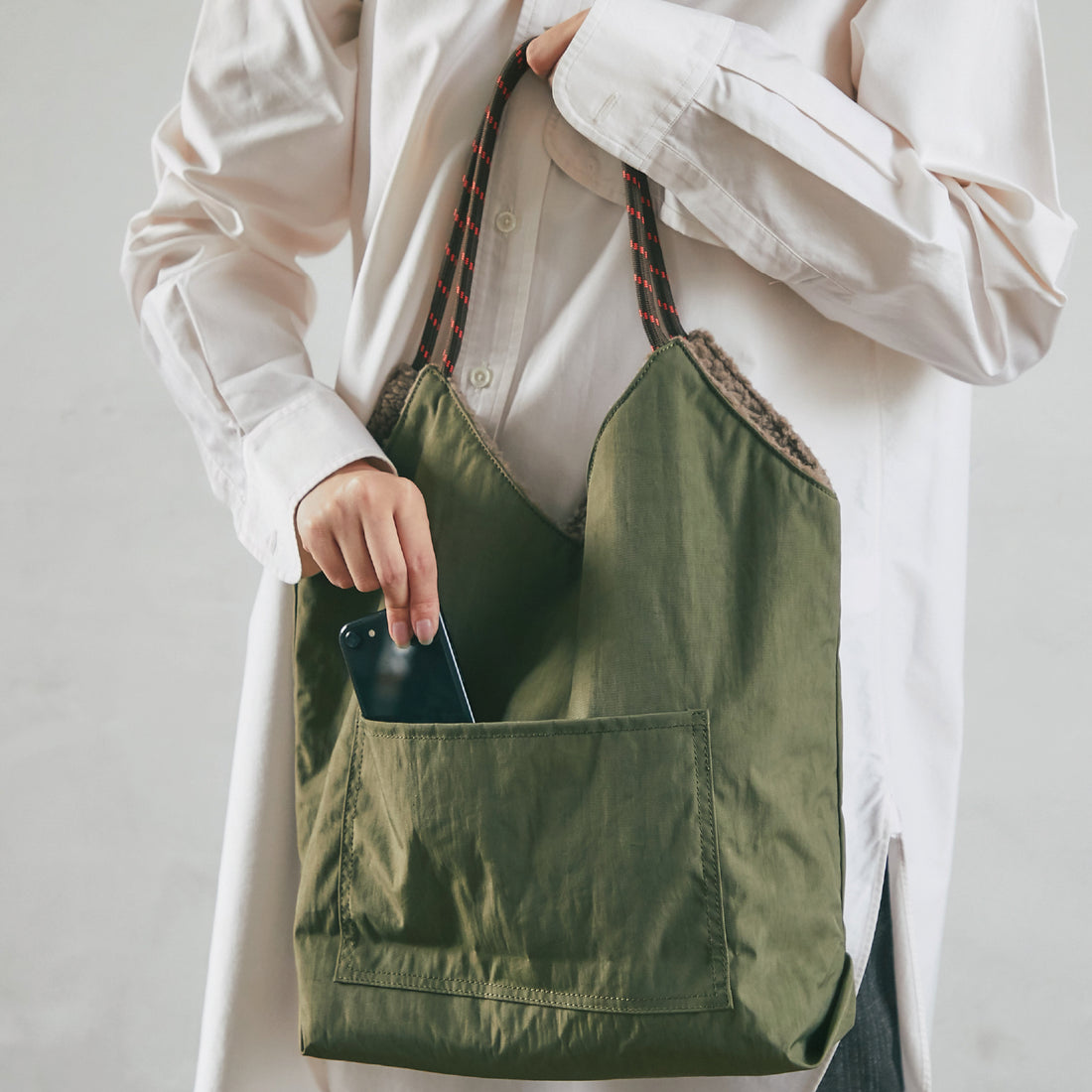 肩の凝らない軽量さがポイントで、持ち手のカラフルなドローコードがアクセントになっています。表裏で素材感を変えているのでコーディネートやシチュエーションで使い分けが出来ます。