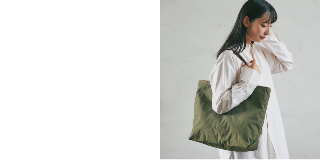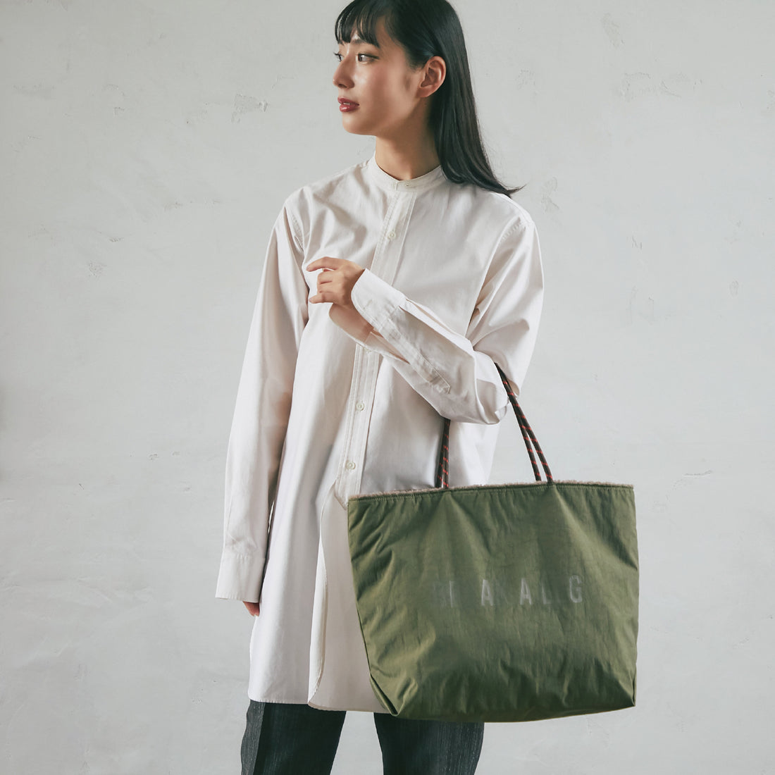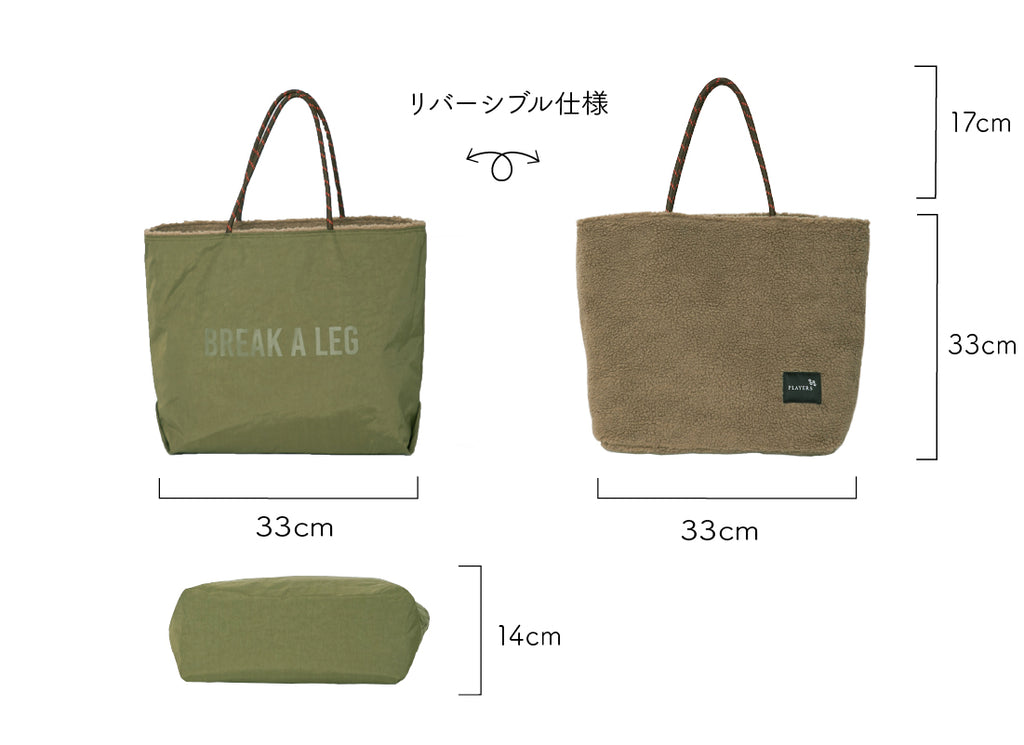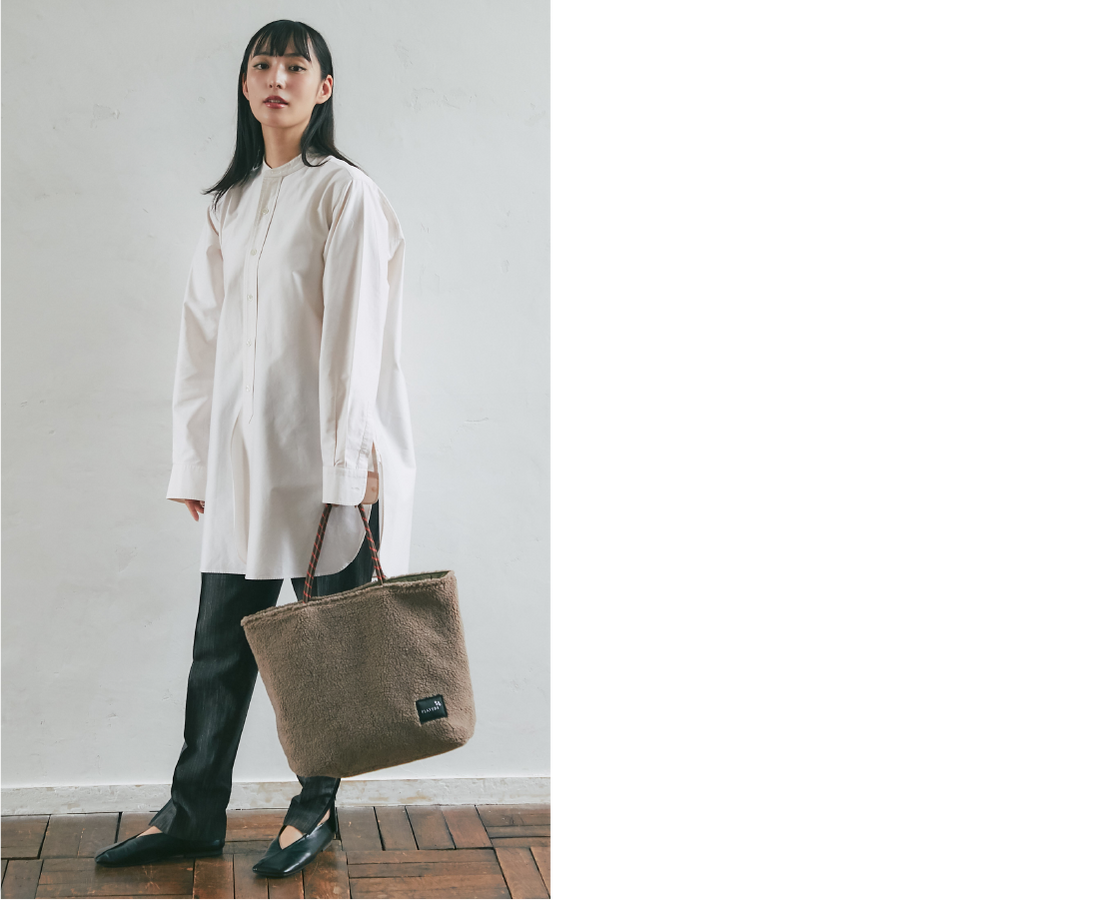 表裏で素材感を変えているのでコーディネートやシチュエーションで使い分けが出来ます。程よいサイズ感でご近所へのお買い物やちょっとしたお出かけなど幅広くお使い頂けます。
