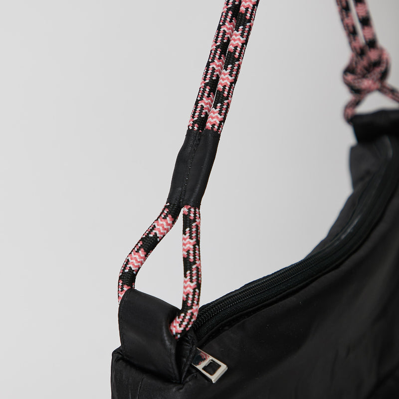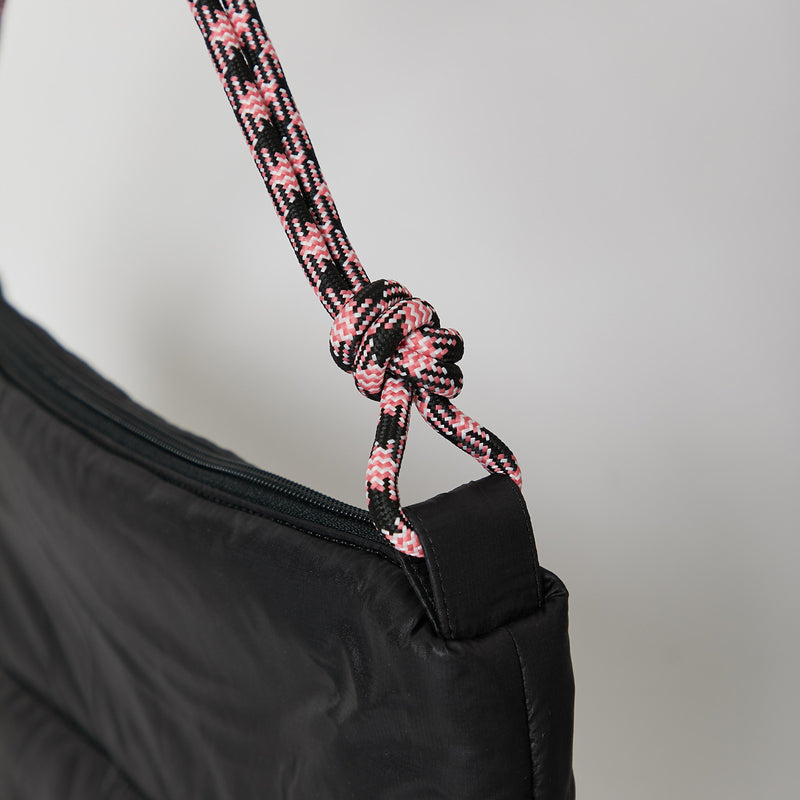 太めのロープがカラーリングのアクセント。二本束ねているので重たいものをいれても食い込みにくいのがうれしい。
