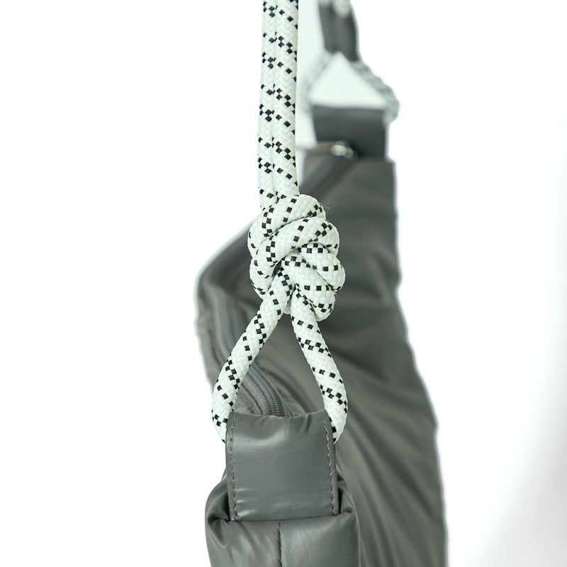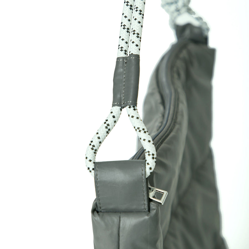 太めのロープがカラーリングのアクセント。二本束ねているので重たいものをいれても食い込みにくいのがうれしい。