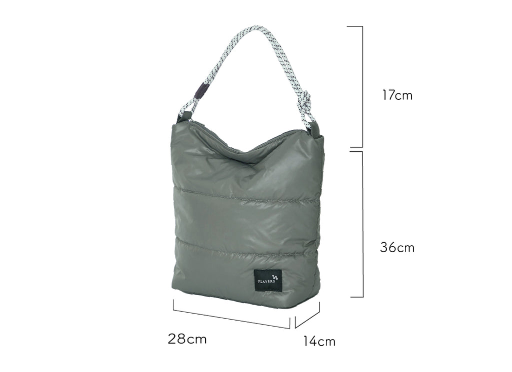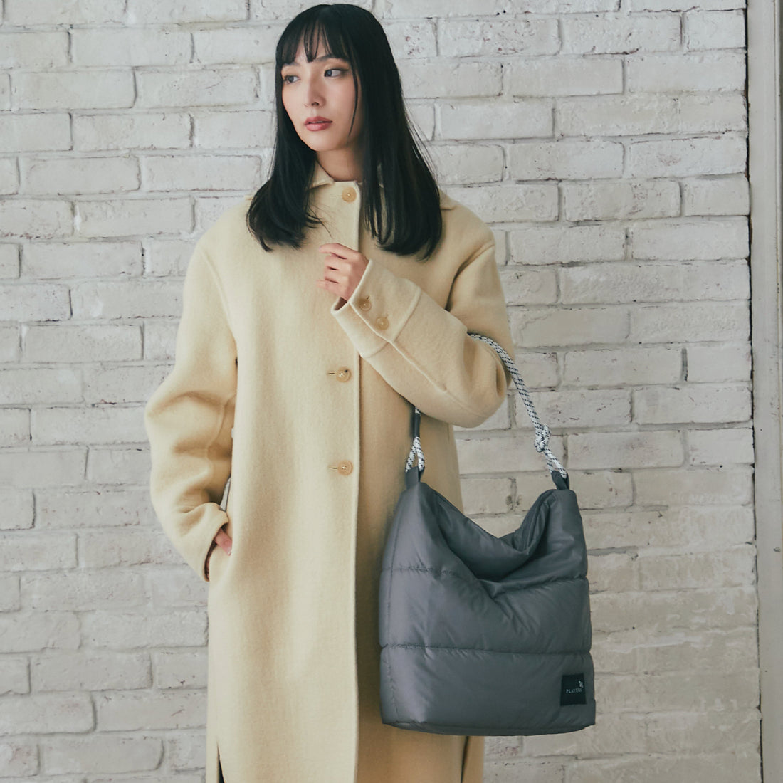 中綿入りのボディは軽くふんわりした持ち心地。 開口部をくしゃっとへこませて持つのがおすすめです。