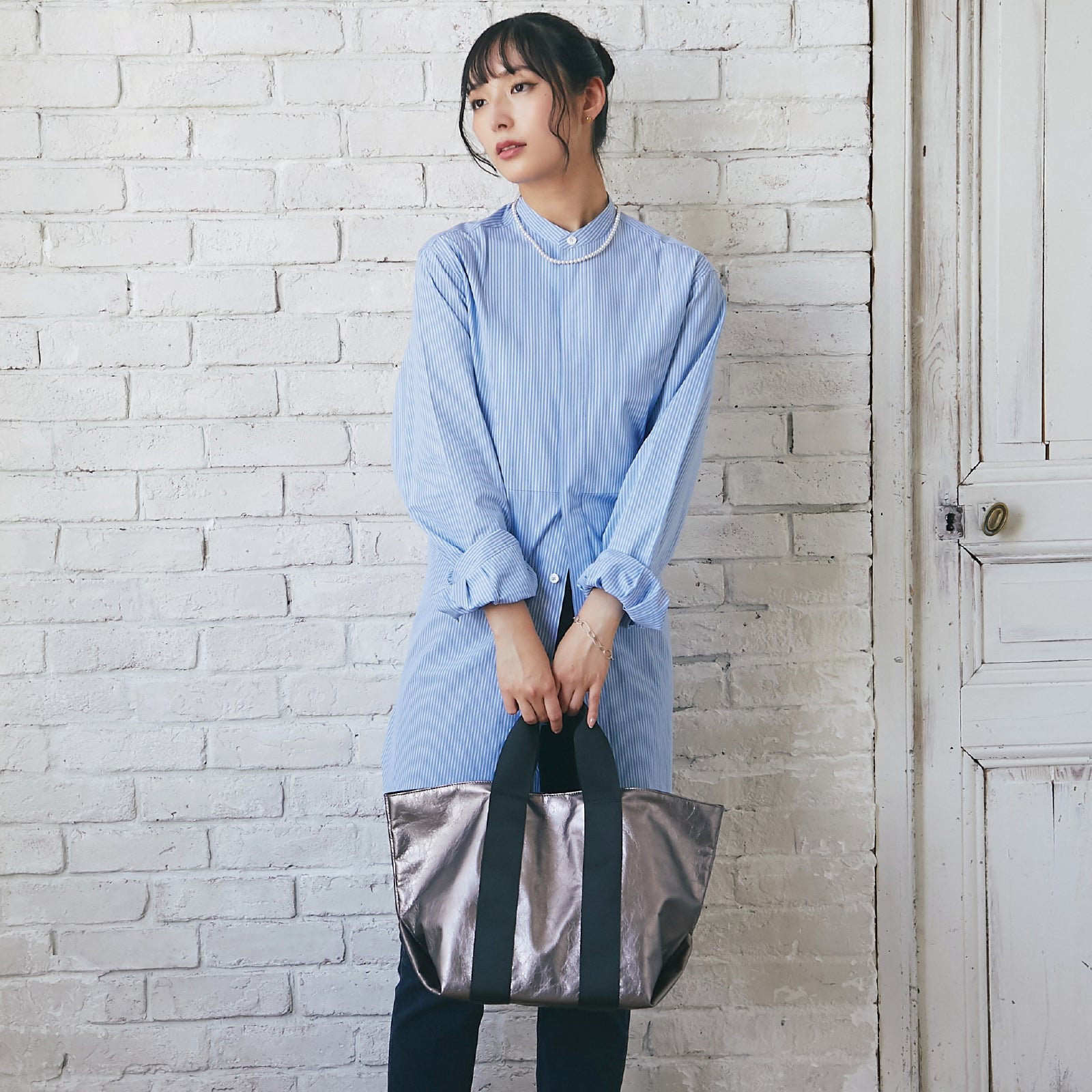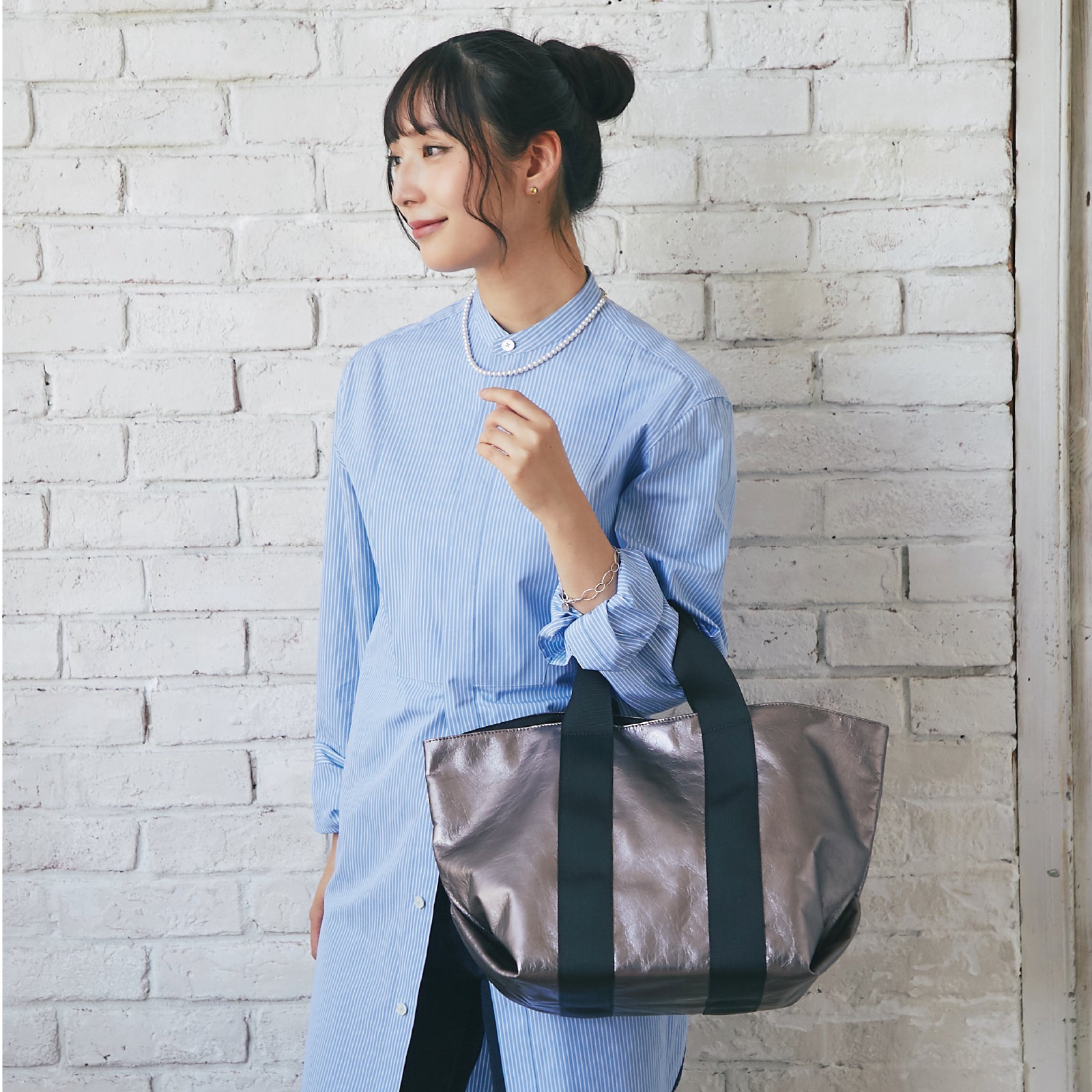 しわ加工を施した合皮素材で、日常使いにぴったりなデザインです。ちらっと覗く裏地の配色がコーディネートのポイントになります。マチが22cmとたっぷりとした容量のトートバッグです。ファスナーがある内ポケット付きなので、貴重品を分けて収納ができます。