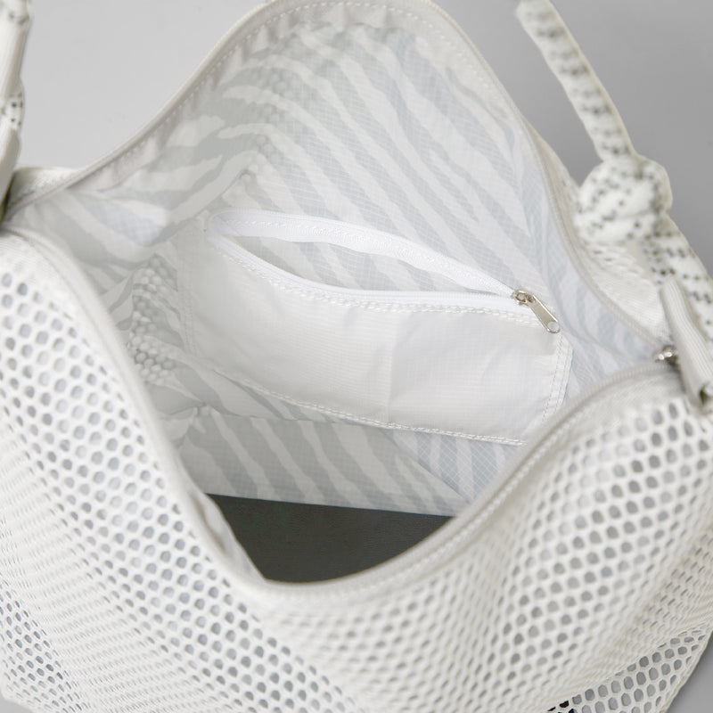 プリント生地の上にメッシュ生地をかぶせてあるので、プリント柄がうっすらのぞきます。カジュアルになりすぎず、さりげない大人の遊び心を演出。 ホワイトはクールなゼブラ柄。