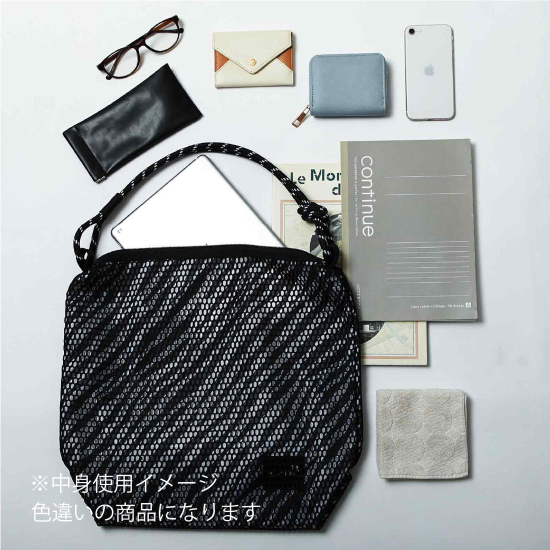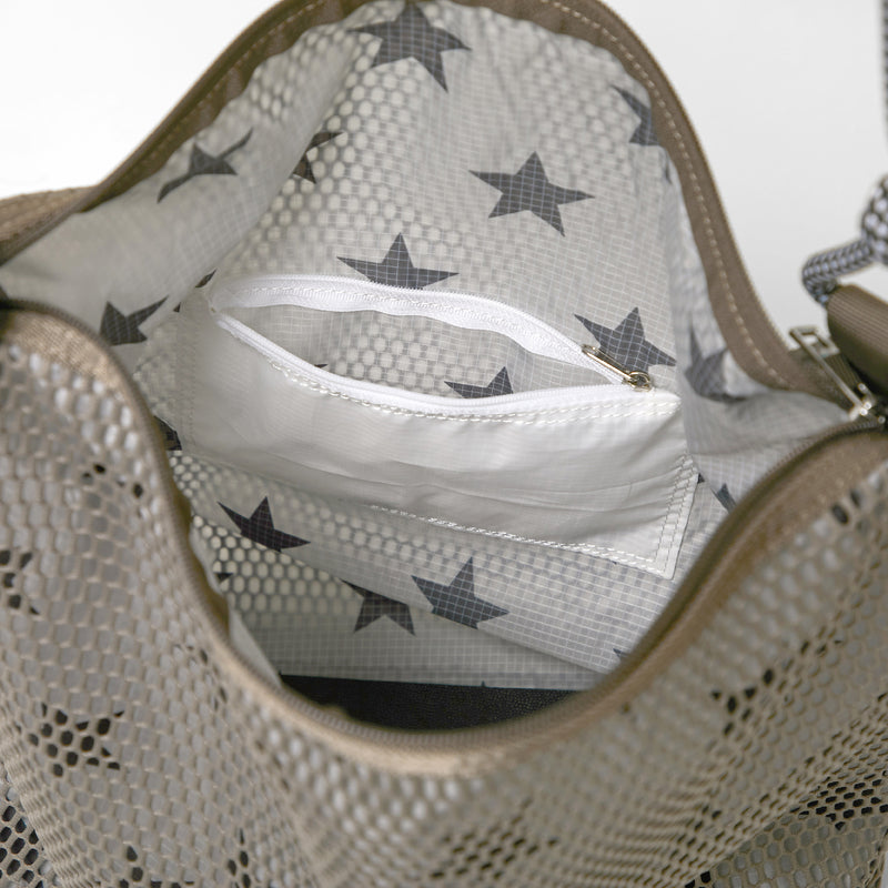 裏地のプリントがほんのりメッシュから透けておしゃれ感があります。 A4サイズまで収納でき、マチ付きで底板もついているため たっぷりと収納していただけます。