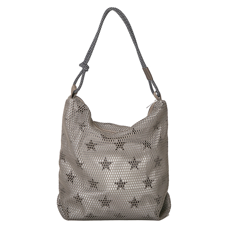 プリント生地の上にメッシュ生地をかぶせてあるので、プリント柄がうっすらのぞきます。カジュアルになりすぎず、さりげない大人の遊び心を演出。 カーキはポップな星柄。