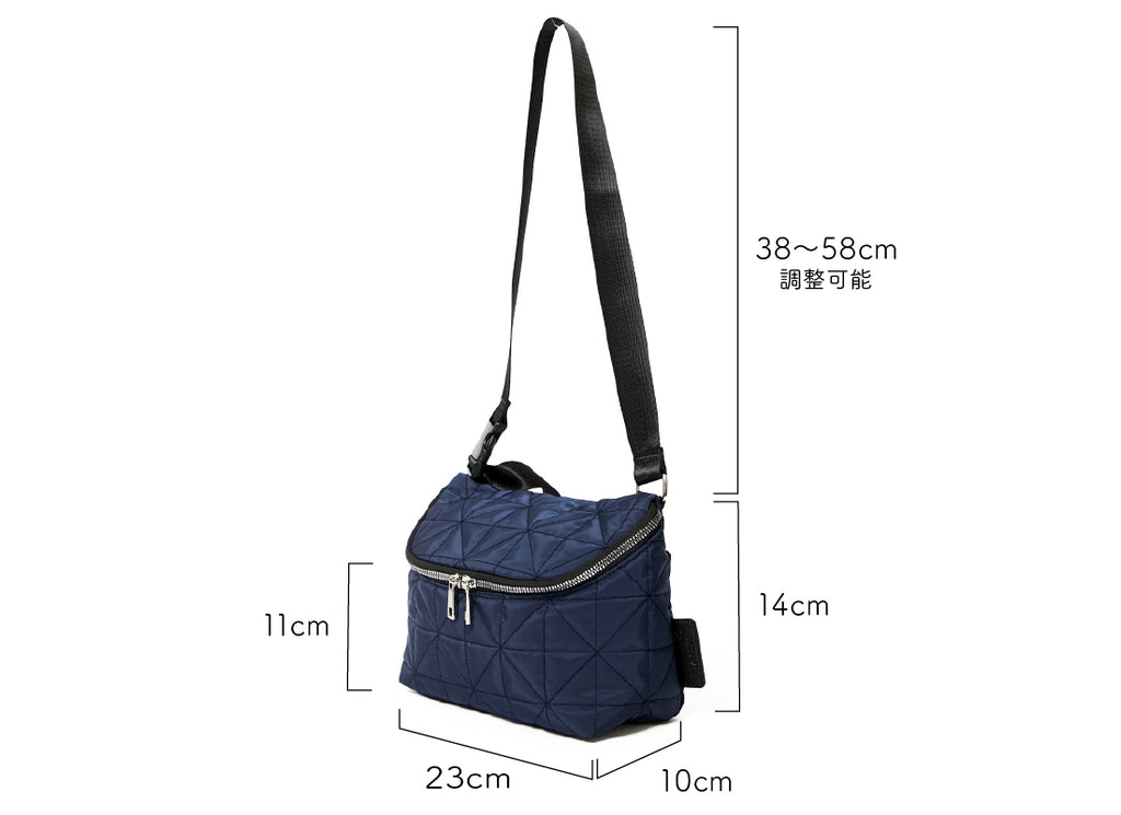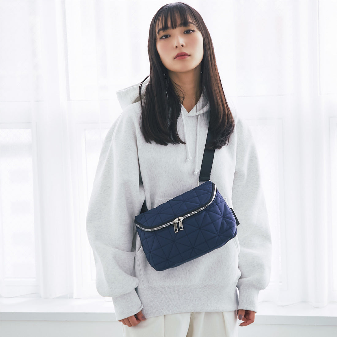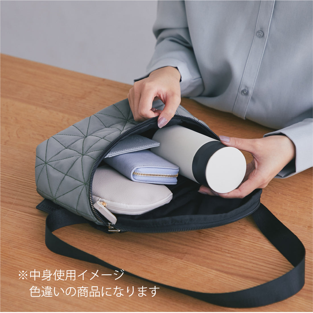 ジオメトリック柄のキルティングのショルダーバッグ。 開口部がファスナーでがばっと開くようにしているので、 小物が取り出しやすいです。 コンパクトながら長財布まですっぽりと収納できるサイズ感は日常使いにもトラベル用のサブバックとしても重宝します。 背胴部分にはファスナーポケットがあり、貴重品の収納に便利です。 ショルダーベルトにはバックルがついているため、着脱が簡単に行えます。