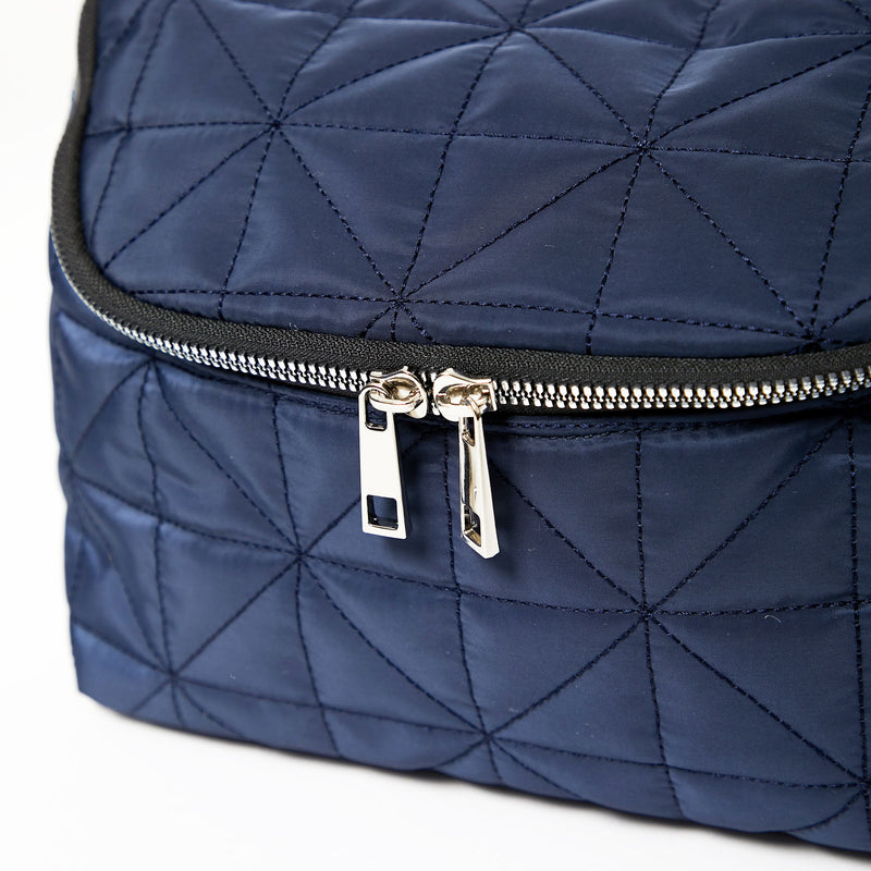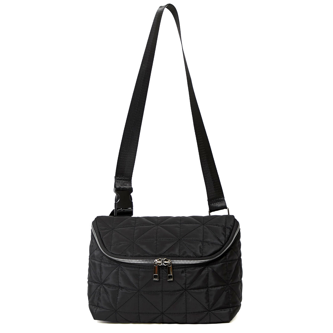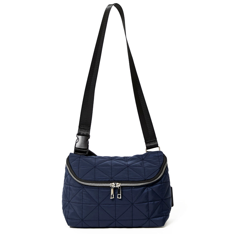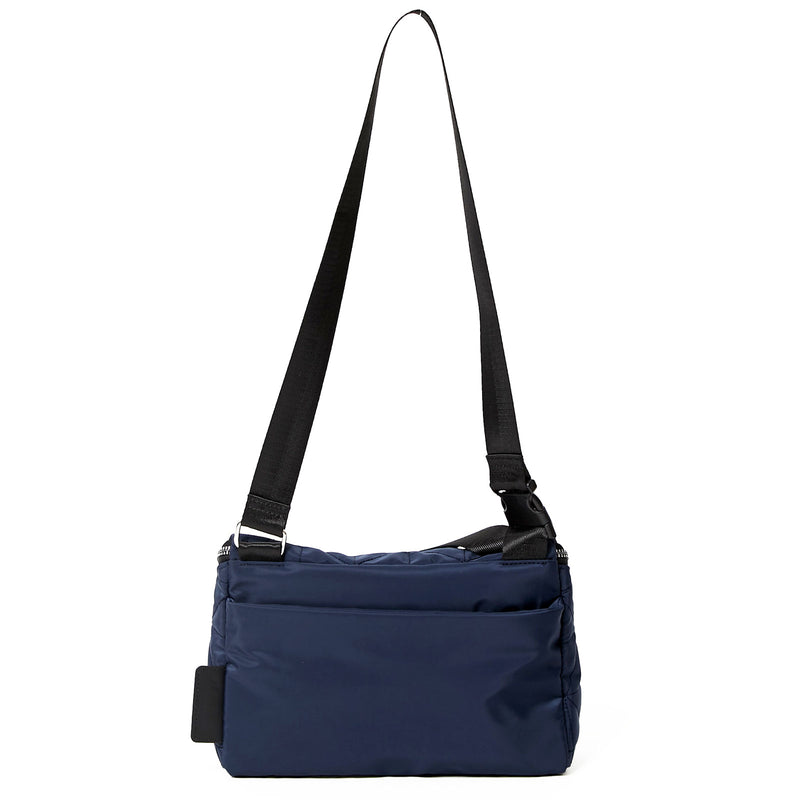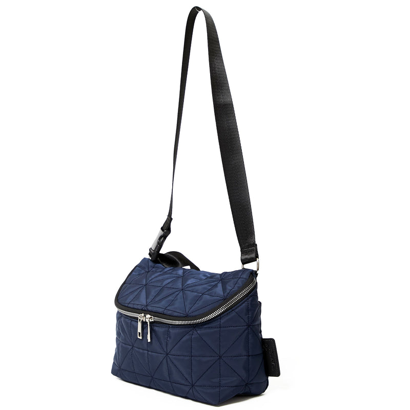 ジオメトリック柄のキルティングのショルダーバッグ。 開口部がファスナーでがばっと開くようにしているので、 小物が取り出しやすいです。 コンパクトながら長財布まですっぽりと収納できるサイズ感は日常使いにもトラベル用のサブバックとしても重宝します。 背胴部分にはファスナーポケットがあり、貴重品の収納に便利です。 ショルダーベルトにはバックルがついているため、着脱が簡単に行えます。