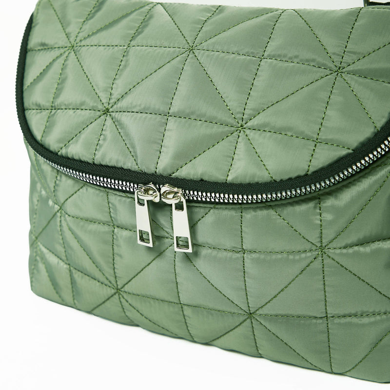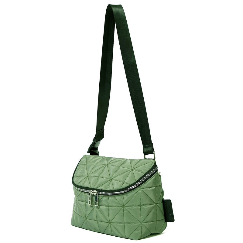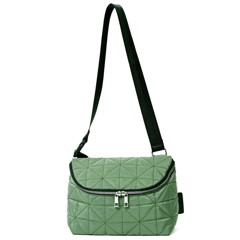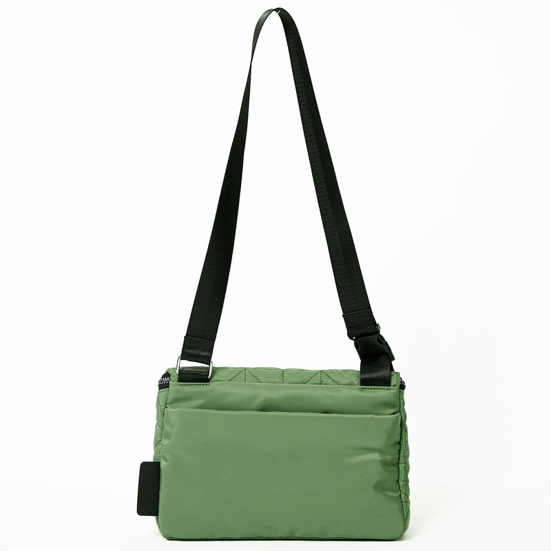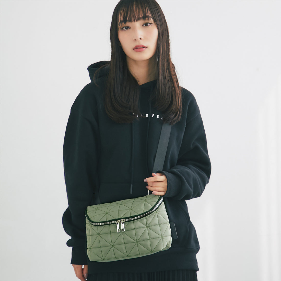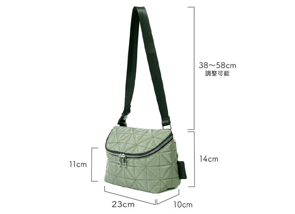 ジオメトリック柄のキルティングのショルダーバッグ。 開口部がファスナーでがばっと開くようにしているので、 小物が取り出しやすいです。 コンパクトながら長財布まですっぽりと収納できるサイズ感は日常使いにもトラベル用のサブバックとしても重宝します。 背胴部分にはファスナーポケットがあり、貴重品の収納に便利です。 ショルダーベルトにはバックルがついているため、着脱が簡単に行えます。
