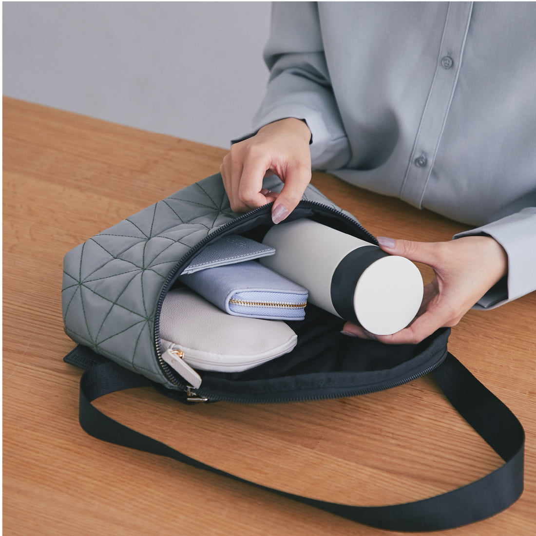 しっかり底とマチがあるので見た目よりずっと大容量。財布やポーチ、スマートフォン、タンブラーまで入ります。開けやすいダブルジップも嬉しい。