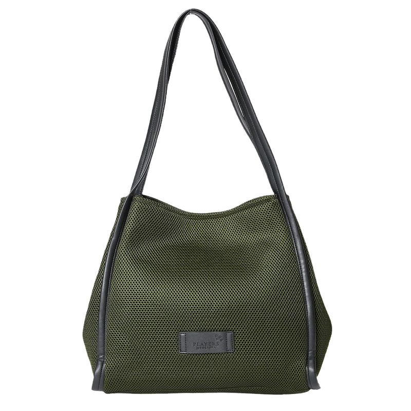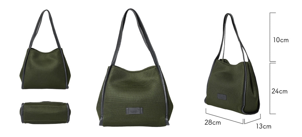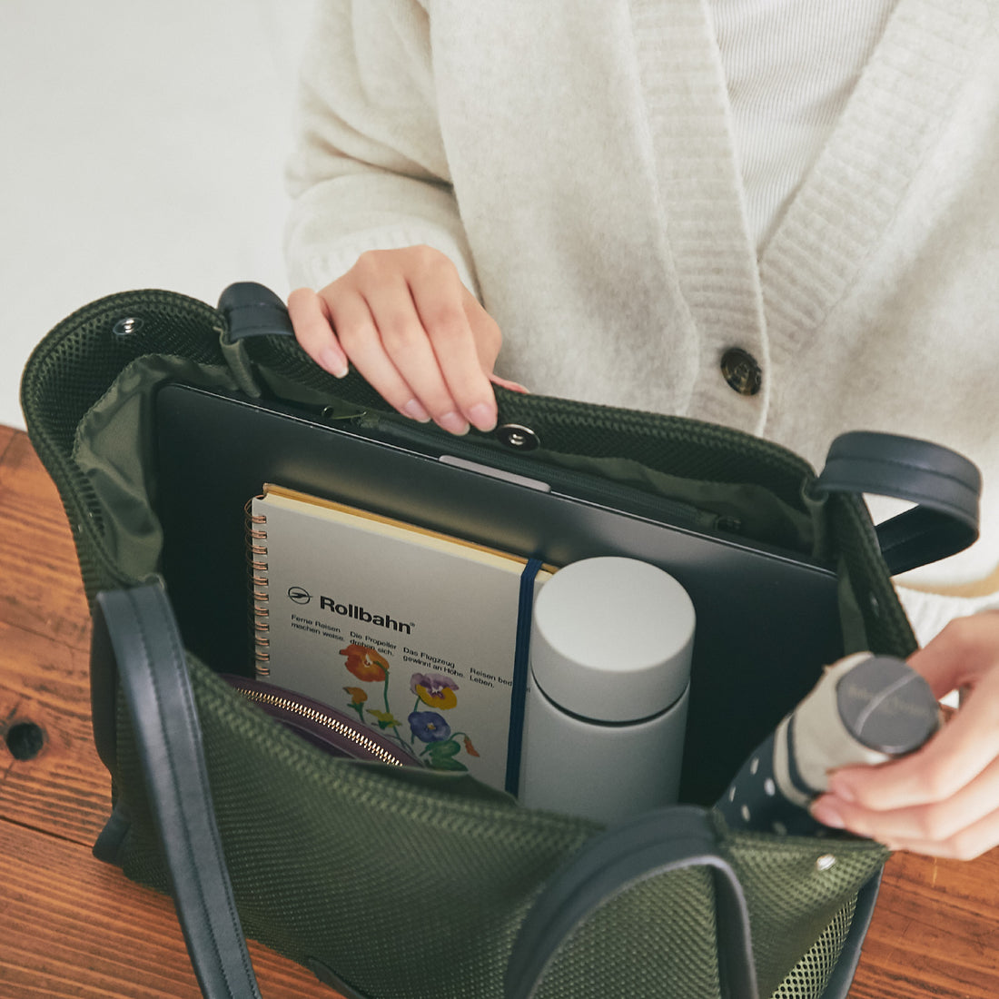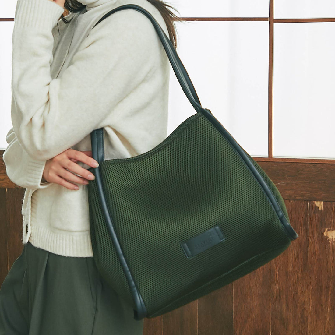 トレンドのメッシュ素材を使用したトートバッグです。ノートパソコンや書類がすっぽりと収まる大容量。 軽量で柔らかい素材はアクティブに活動する日にも大活躍です。マザーズバッグやジム通いの際にもぴったりです。バッグ開口部はマグネット式で物の出し入れが間単におこなえます。サイドのスナップボタンを留めればよりシンプルなフォルムでお使い頂けます。持ち手は長めに作られているので肩かけ時もゆったりとお使い頂けます。