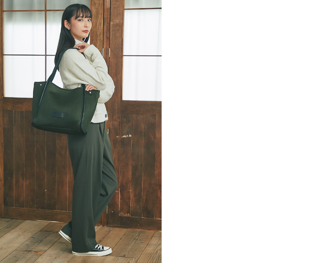 荷物が少なめのときは内側についているマグネットボタンを留めると、簡単にコンパクトなフォルムへと変えられます