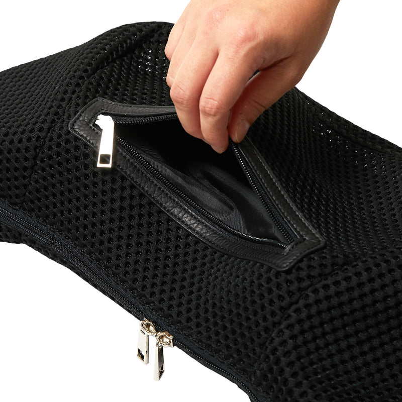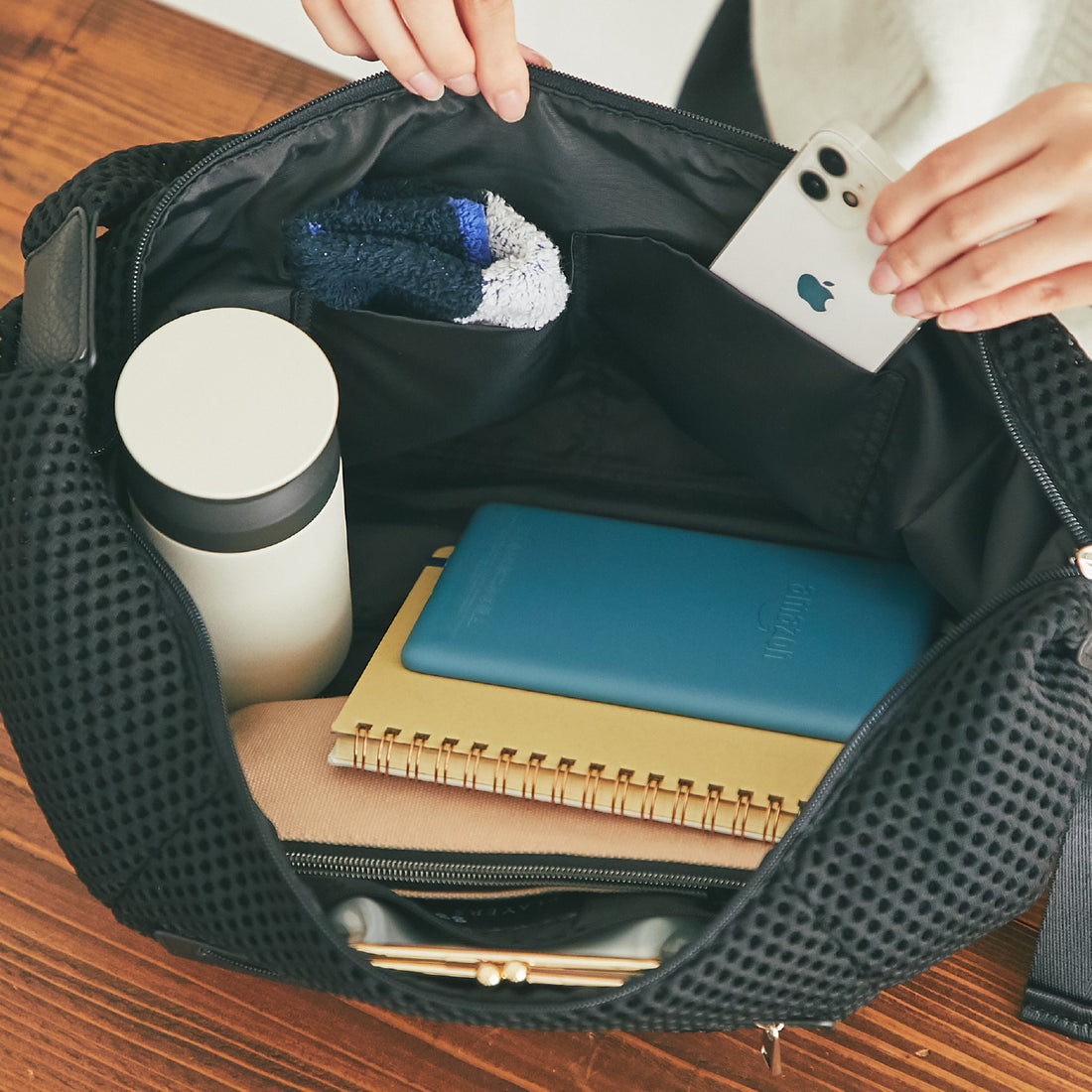 大きめのポーチや長財布もすっぽり入るファスナーポケット。