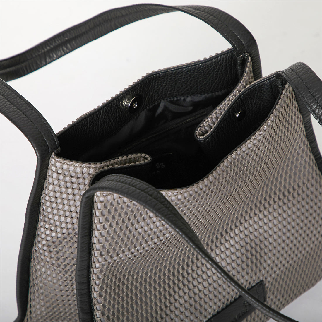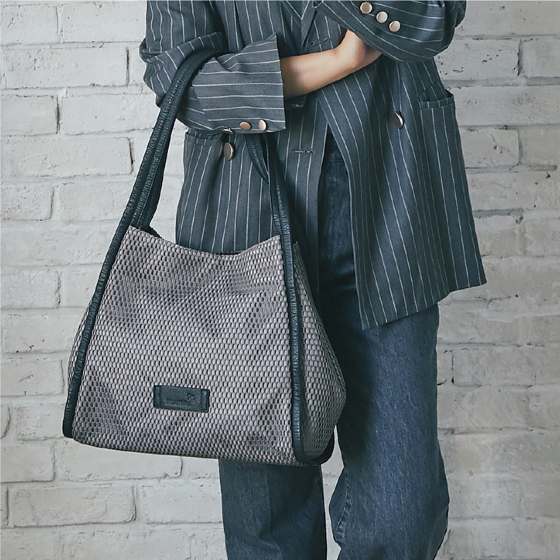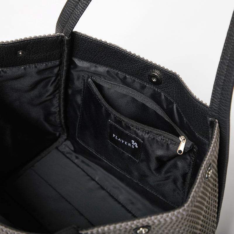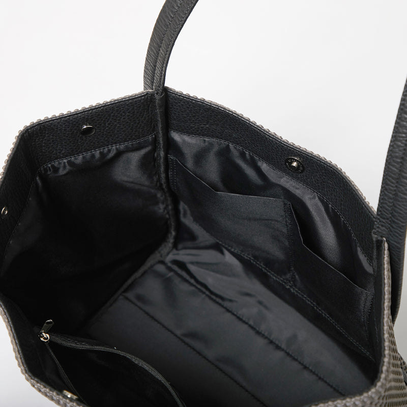 長めのハンドルで肩にかけたまま荷物の出し入れが出来るのがポイントです。内側には、貴重品を入れるのに最適なファスナーポケットと 小物の仕分けに適したオープンポケットが2か所あります。開口部は荷物の飛び出しを防ぐスナップボタン付き。