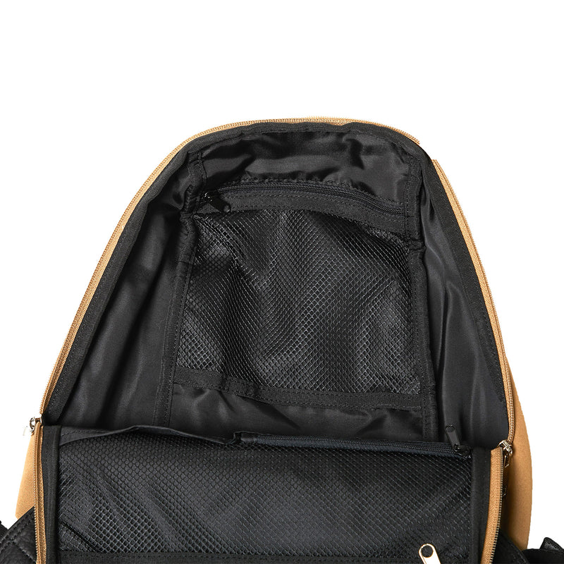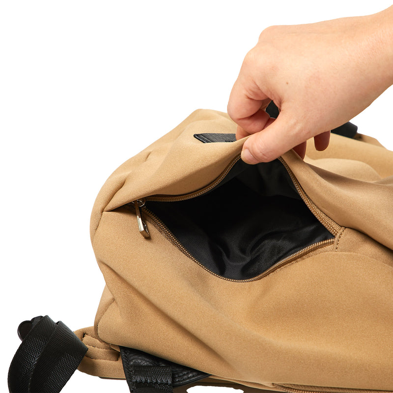 コンパクトなサイズ感ながら機能性に特化しているため、デイリーユースに最適なリュックです。 ファスナーポケット、オープンポケットがメイン開口部に4つあり小物の整理整頓がし易いです。 前面のポケットは左右にそれぞれ独立したファスナー式のポケットが付いています。片方のポケットの内側にはカラビナ付きで鍵などを留めることが可能です。 両開きファスナーを使用しているので利き手に関わらず開け閉めがし易いです。