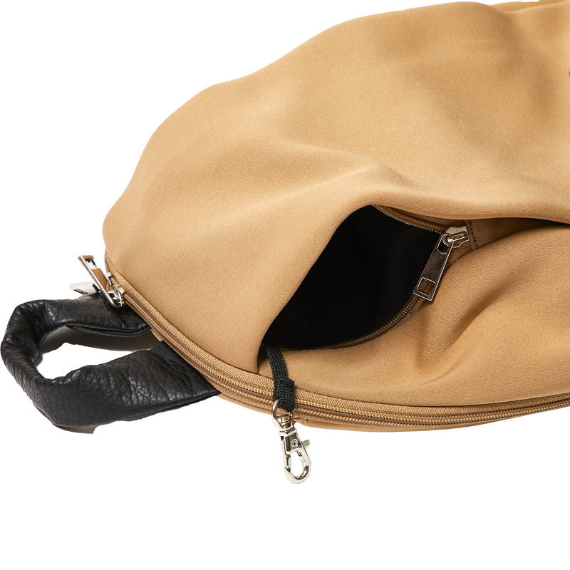 財布などの貴重品は深い外ポケット下部へ。取り出しやすさと安全性を両立。 上部ポケットと下部ポケットは中で仕切られているので、中身がごちゃつくこともありません。