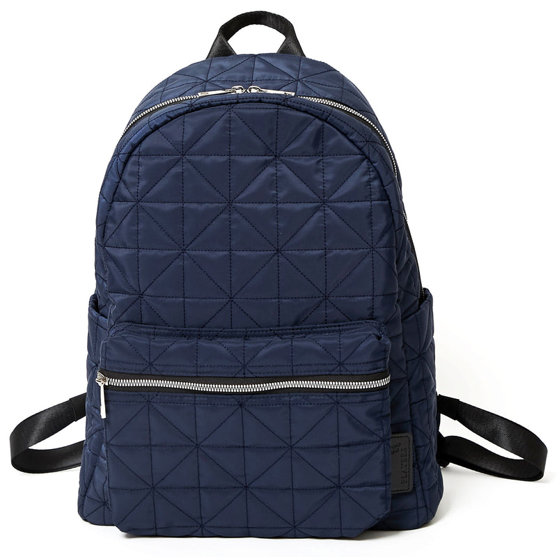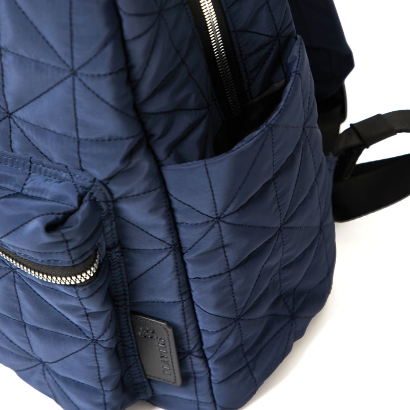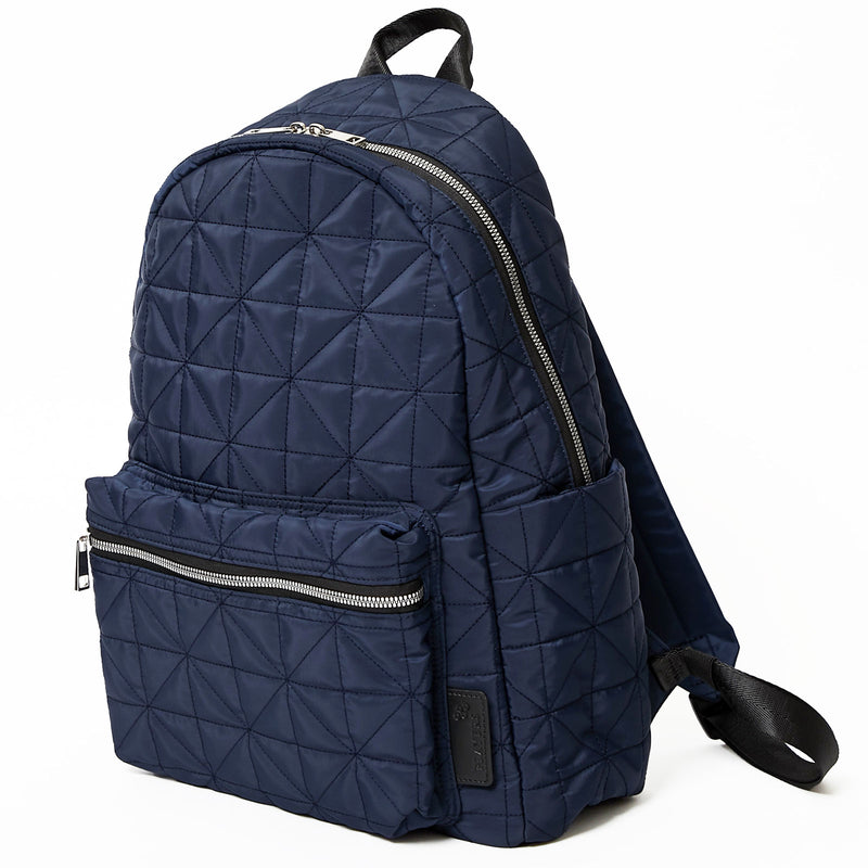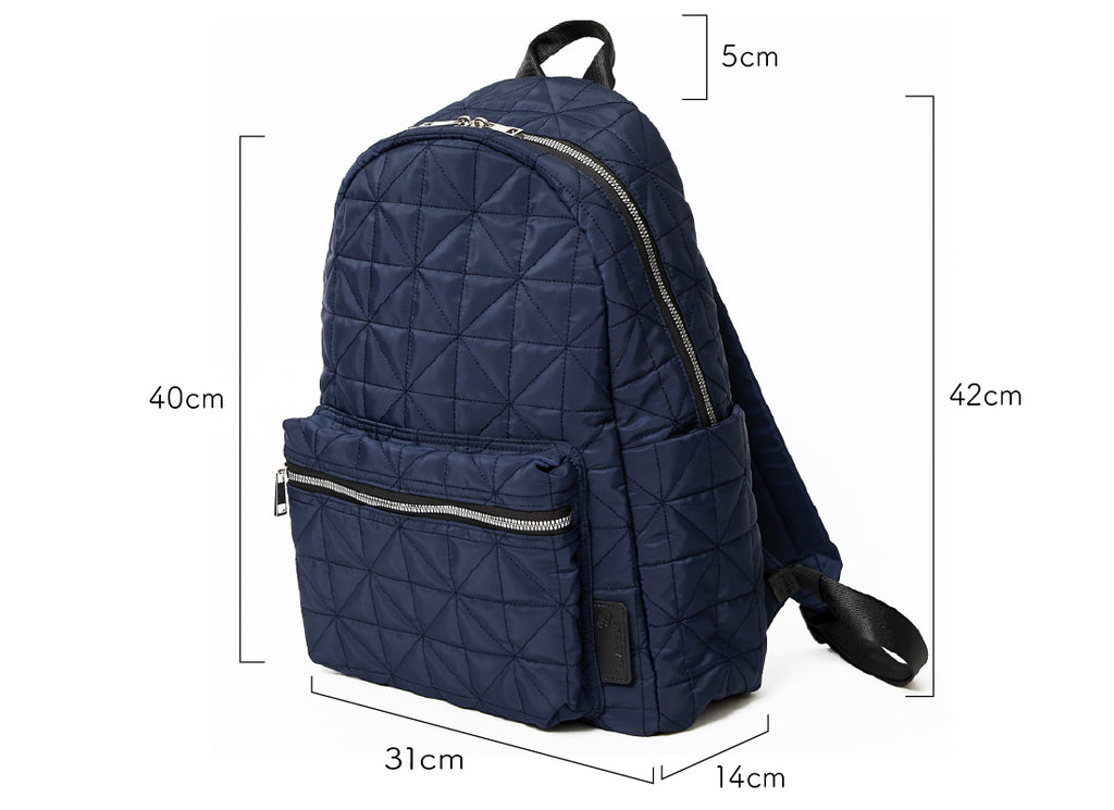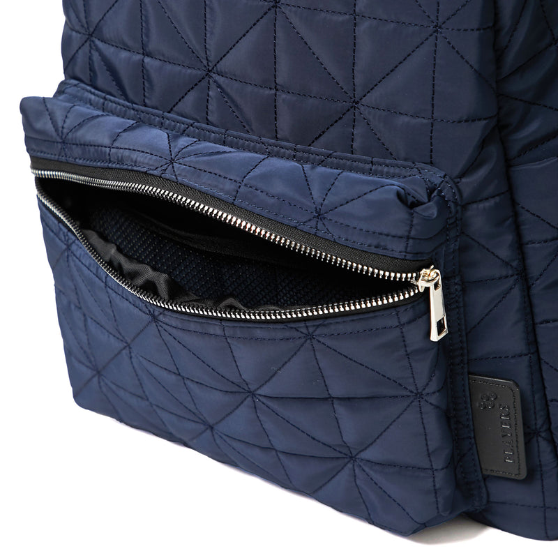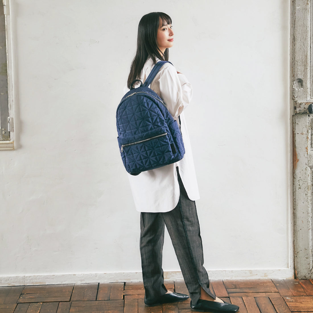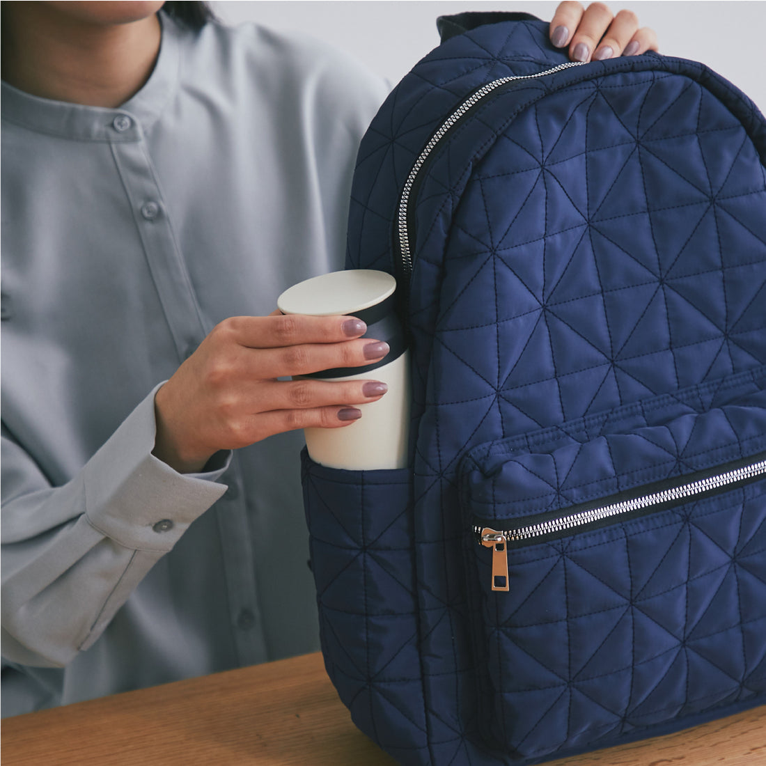 ジオメトリック柄のキルティングリュック。タウンユースがしやすいサイズ感ながら、メイン部分にはタブレットなどの収納に便利なオープンポケット、メッシュ素材のオープンポケット、ファスナーポケットがあります。