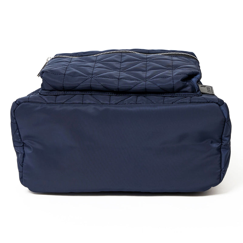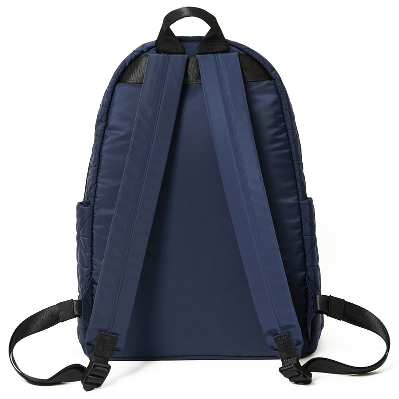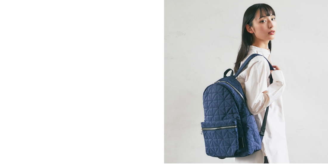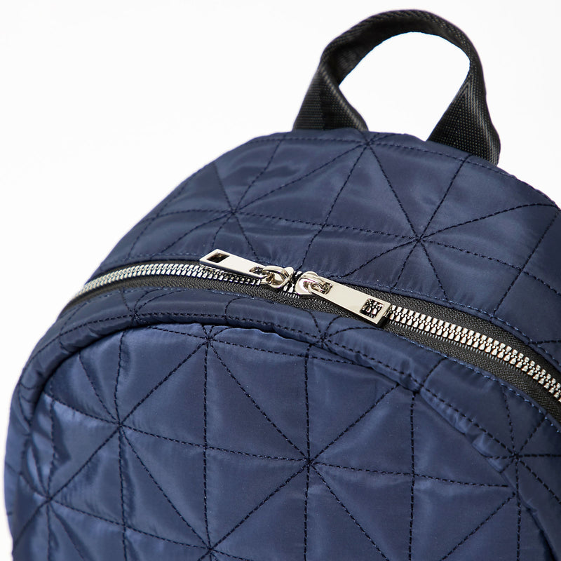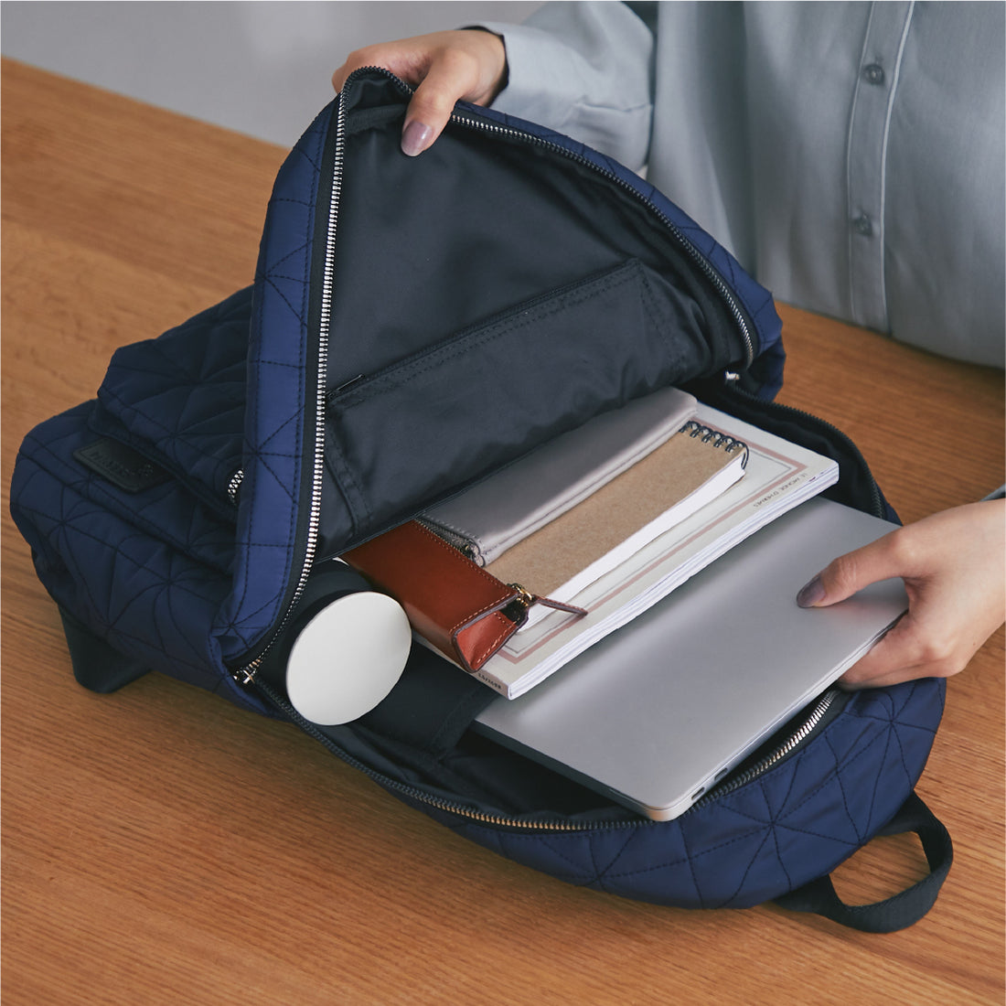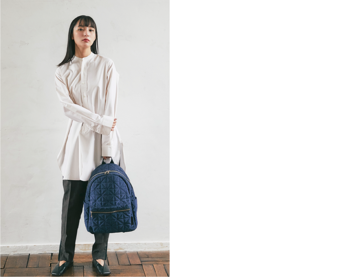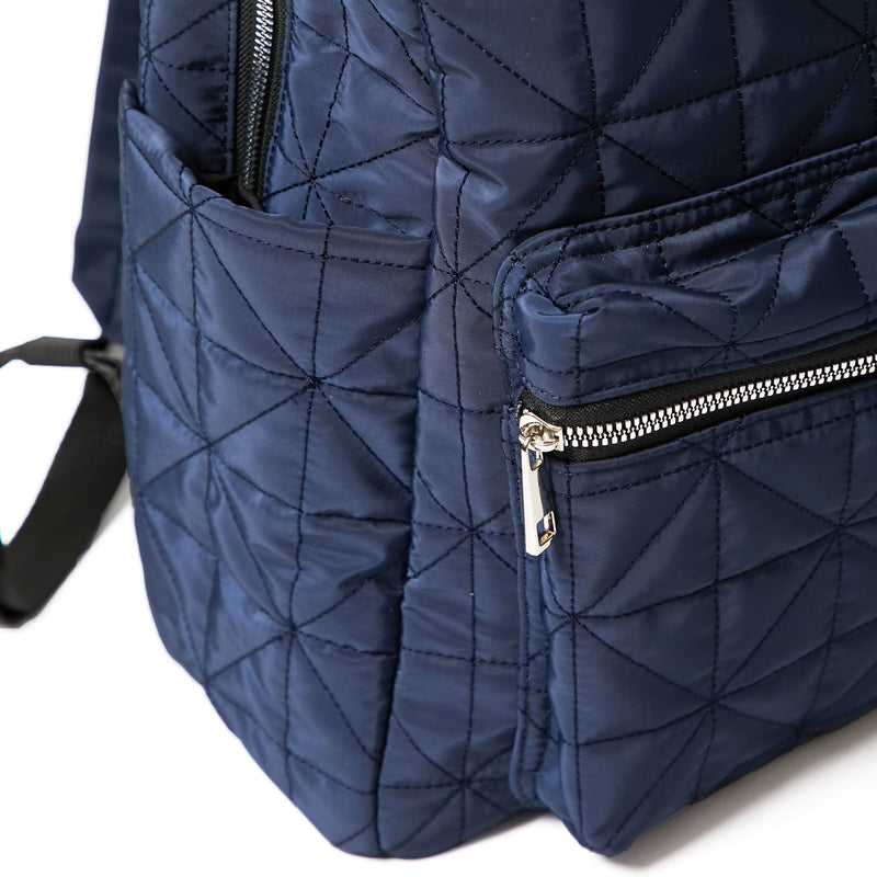 ジオメトリック柄のキルティングリュック。タウンユースがしやすいサイズ感ながら、メイン部分にはタブレットなどの収納に便利なオープンポケット、メッシュ素材のオープンポケット、ファスナーポケットがあります。